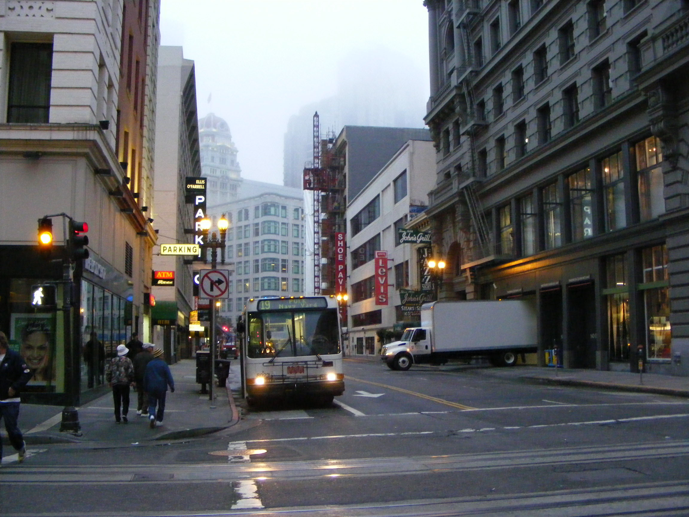 Early one morning late August 2008 before the rush hour and the tourists arrive and the cable car is out of action: the cable between downtown and the Cable Car Sheds has broken. Around the corner NABI 416 8023 is providing a replacement bus service from downtown to the Sheds. Unfortunately the bus is a block away from the Powell & Market terminus and the £19 POLK Navy Yard" destination does little to announce its intentions! |