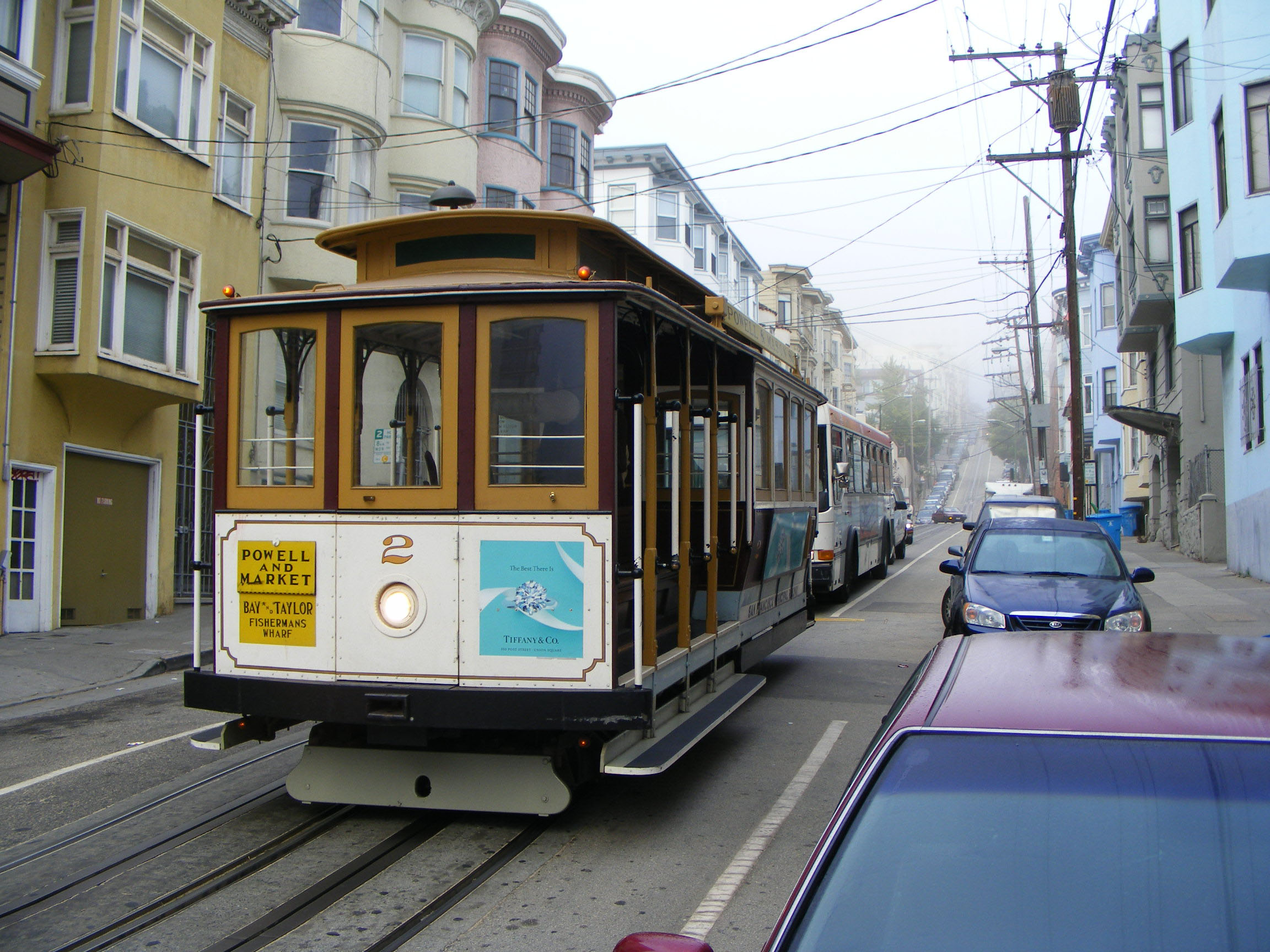 Car Number 2 another six years on and dealing with a bit of an incident. It is early morning in San Francisco in August 2008 and the cable between Powell & Market and the cable car sheds has broken. The bus behind is performing a link service with the helpful destination "Naval Dockyards" - it also departed a block away from Powell & Market with no obvious sign of its purpose - and car 2 was awaiting any passengers who might have discovered the bus to continue their journey on the section of cable that was working.