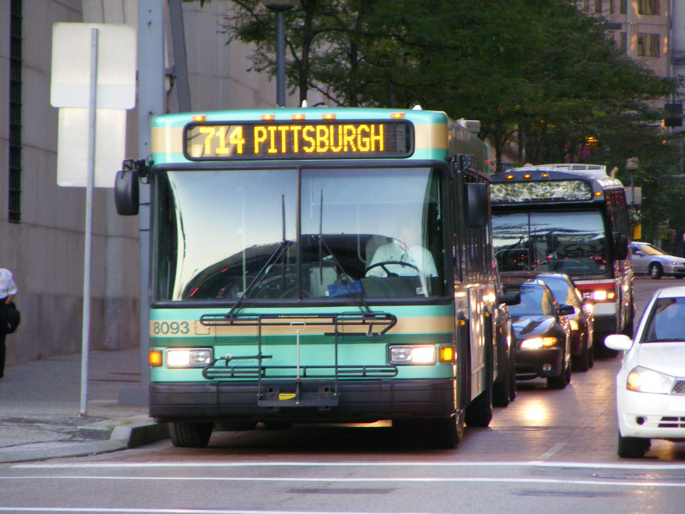 New Castle Area Transit Authority operate a small fleet of buses, some of which work on commuter routes into Pittsburgh. Here Gillig Phantom 128 is on a morning run back into the city in July 2010.