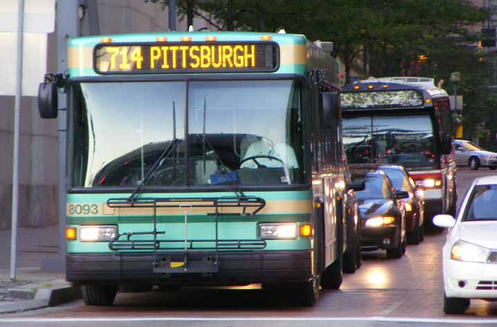 A newer Gillig Advantage, 8093, arrives in the city on route 714 followed by a Port Authority Novabus Classic in the old red, white and black colour scheme, then rapidly disappearing from the cityscape.
