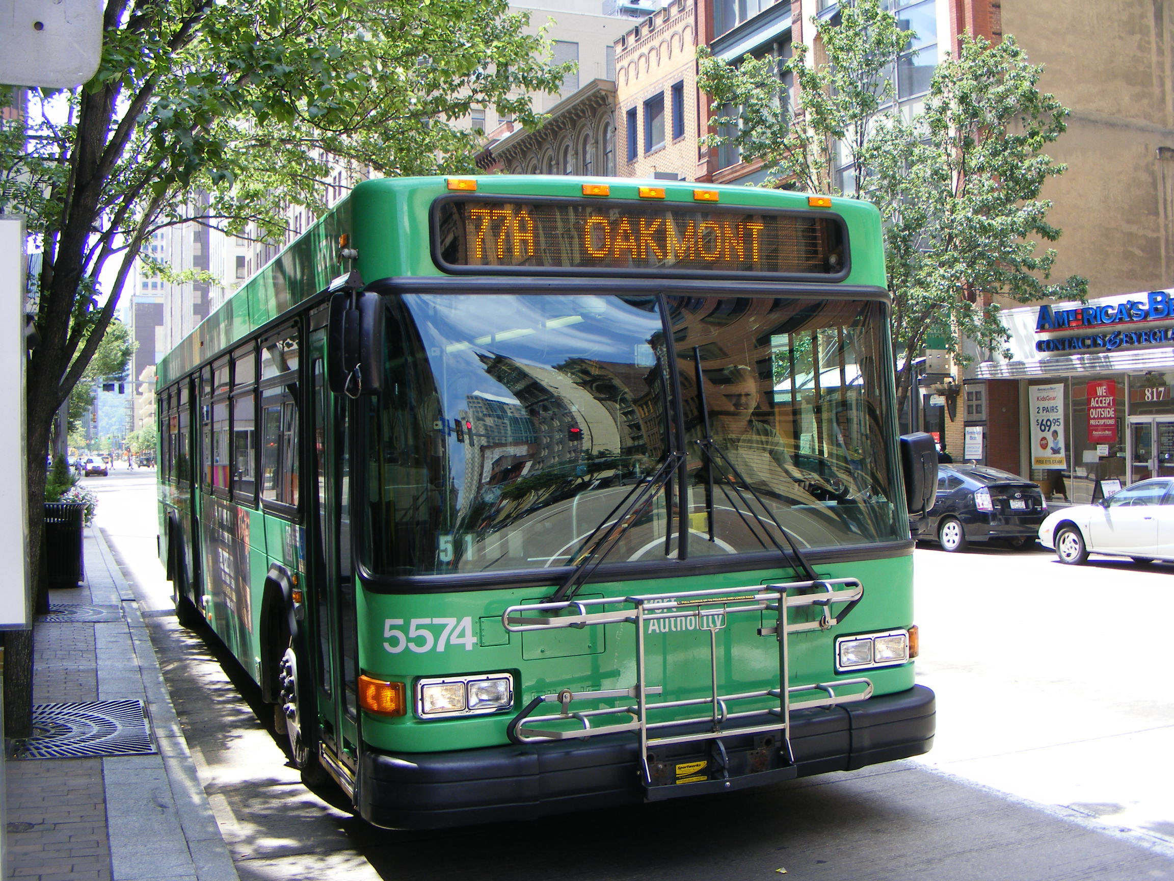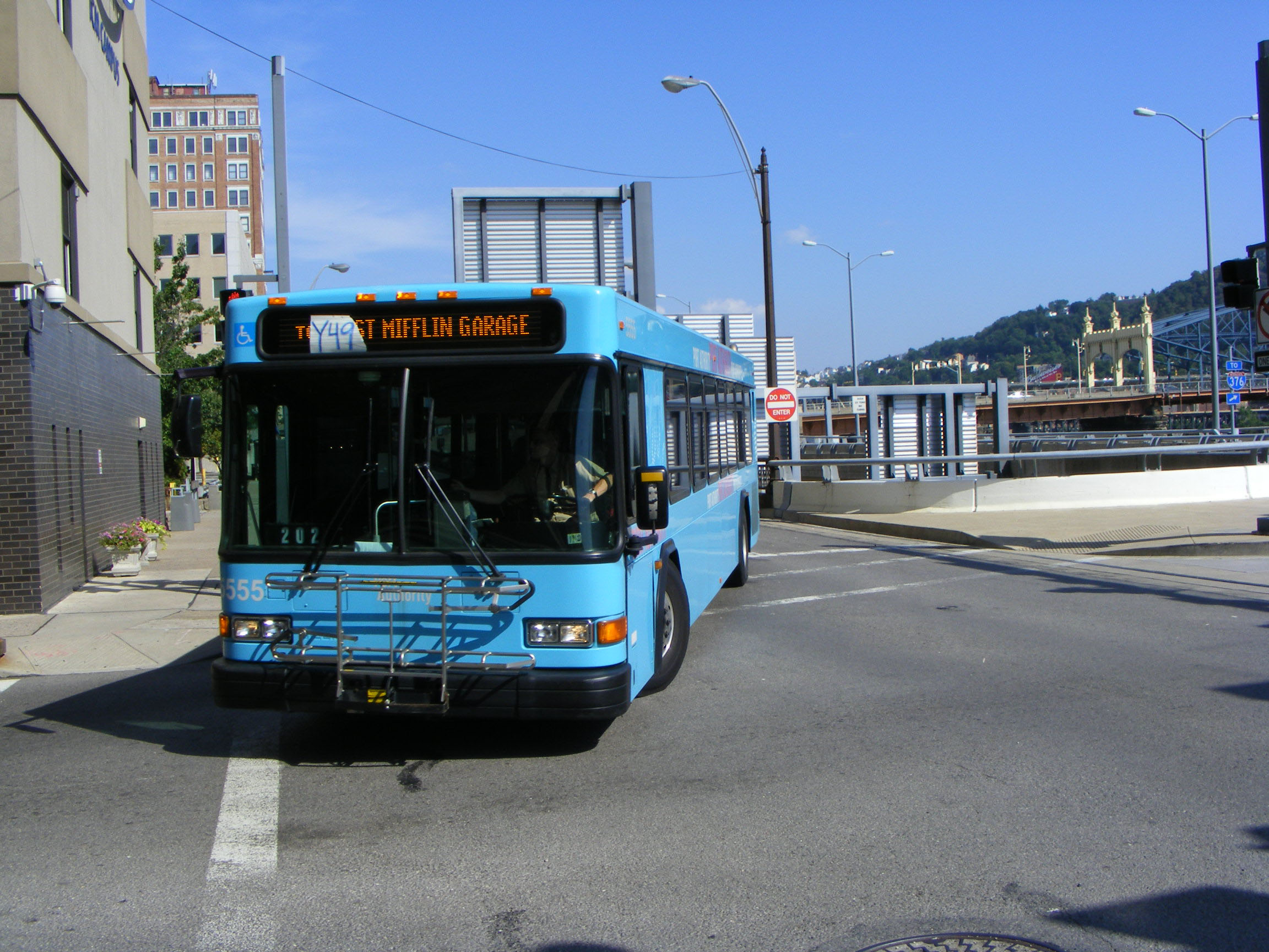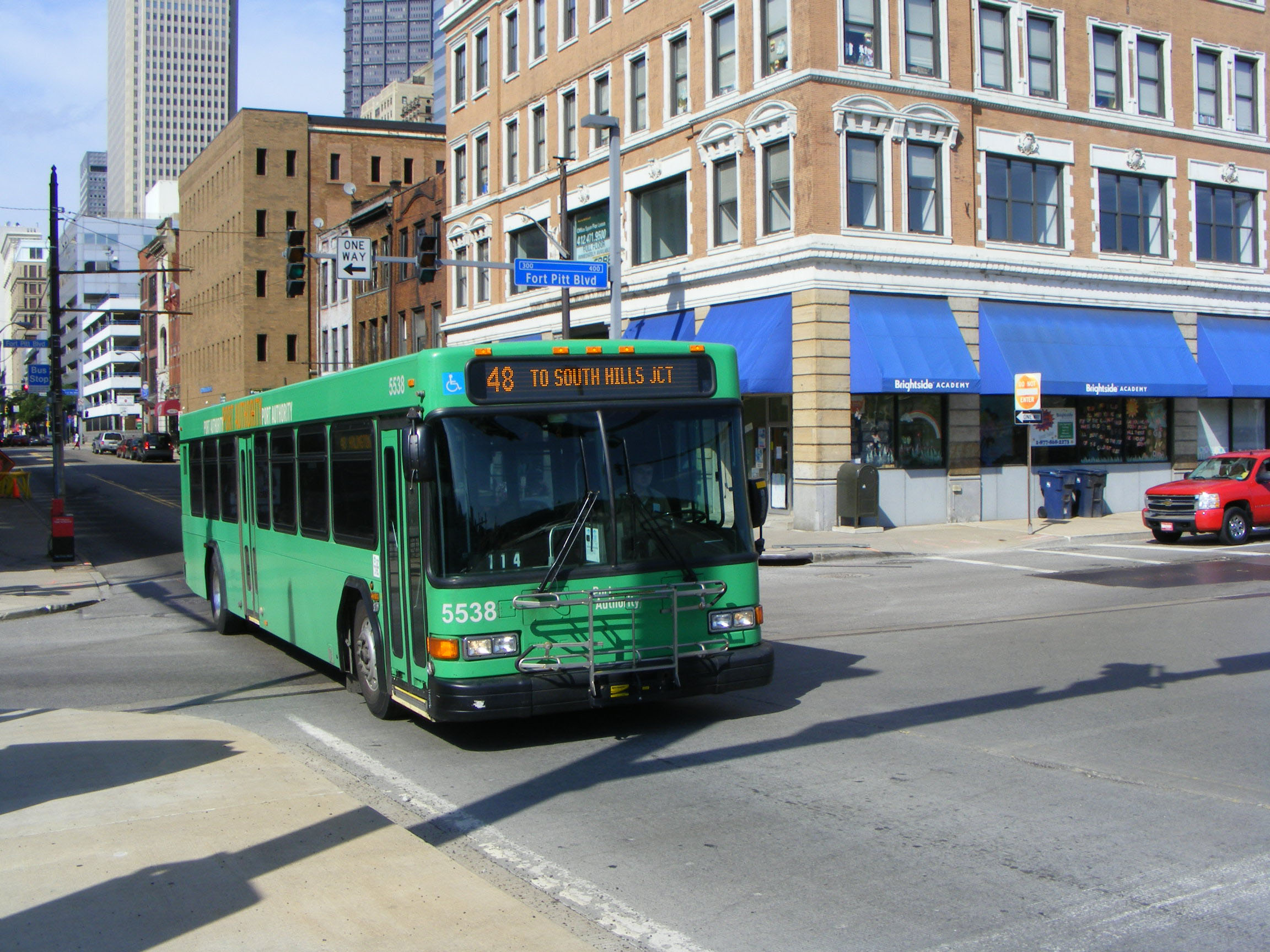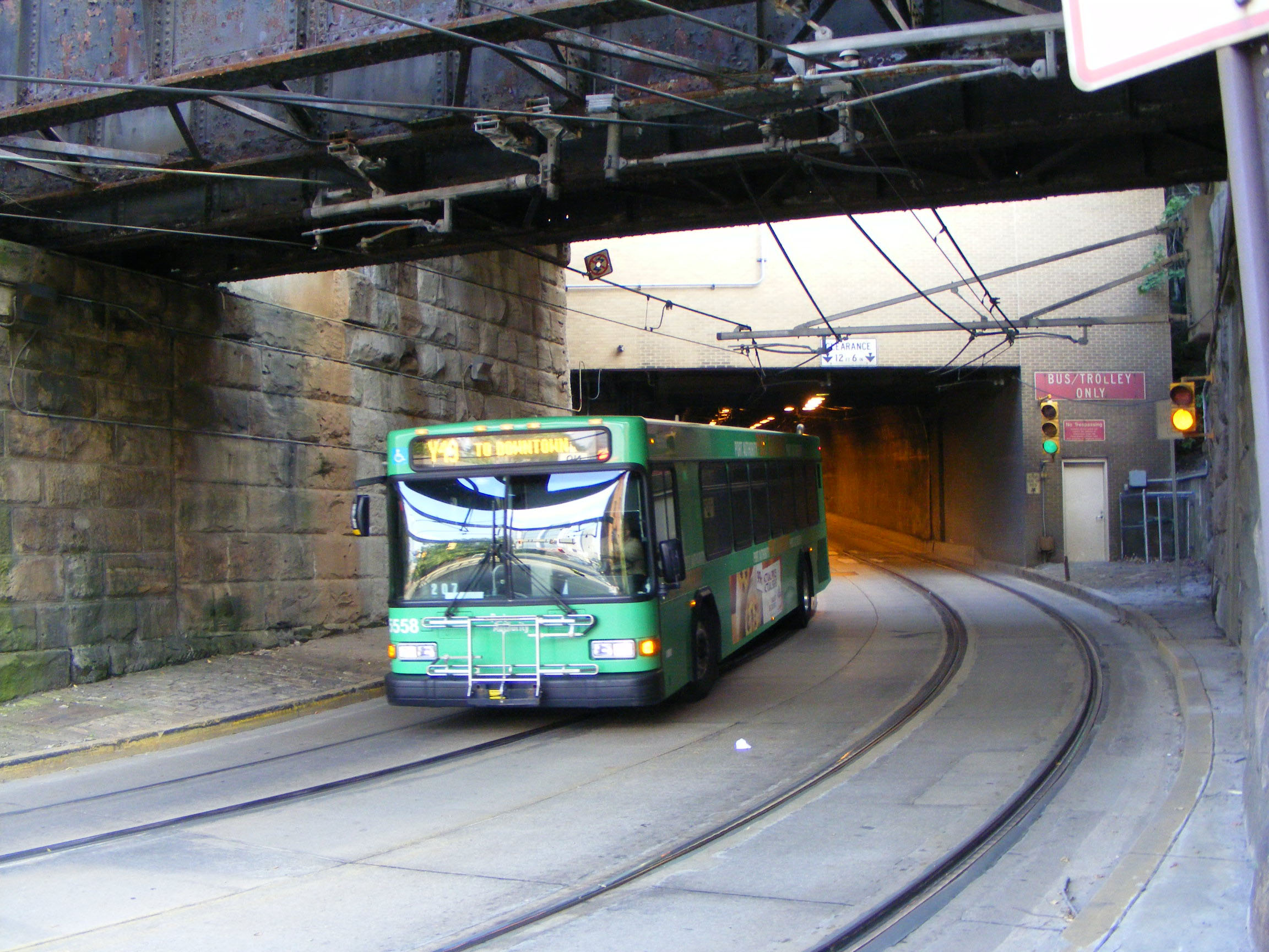 The Southern Busway shares its track with the Metro tram system to slice through the heights on the west bank of the Monongahela River. Here Gillig 5558 emerges at the bottom of the incline by the Station Square, a popular tourist destination and departure point for the local DUKW (duck) tours.
