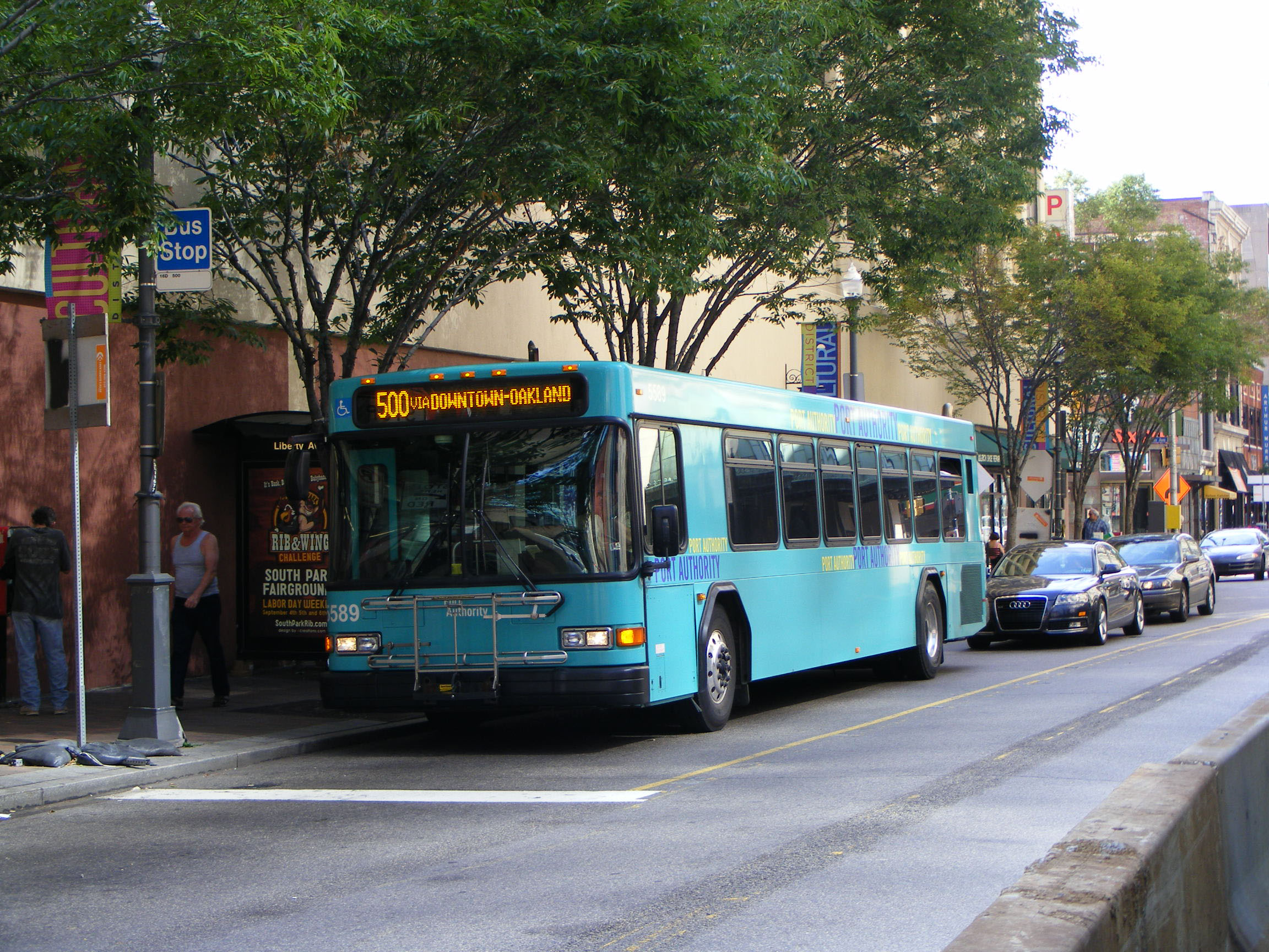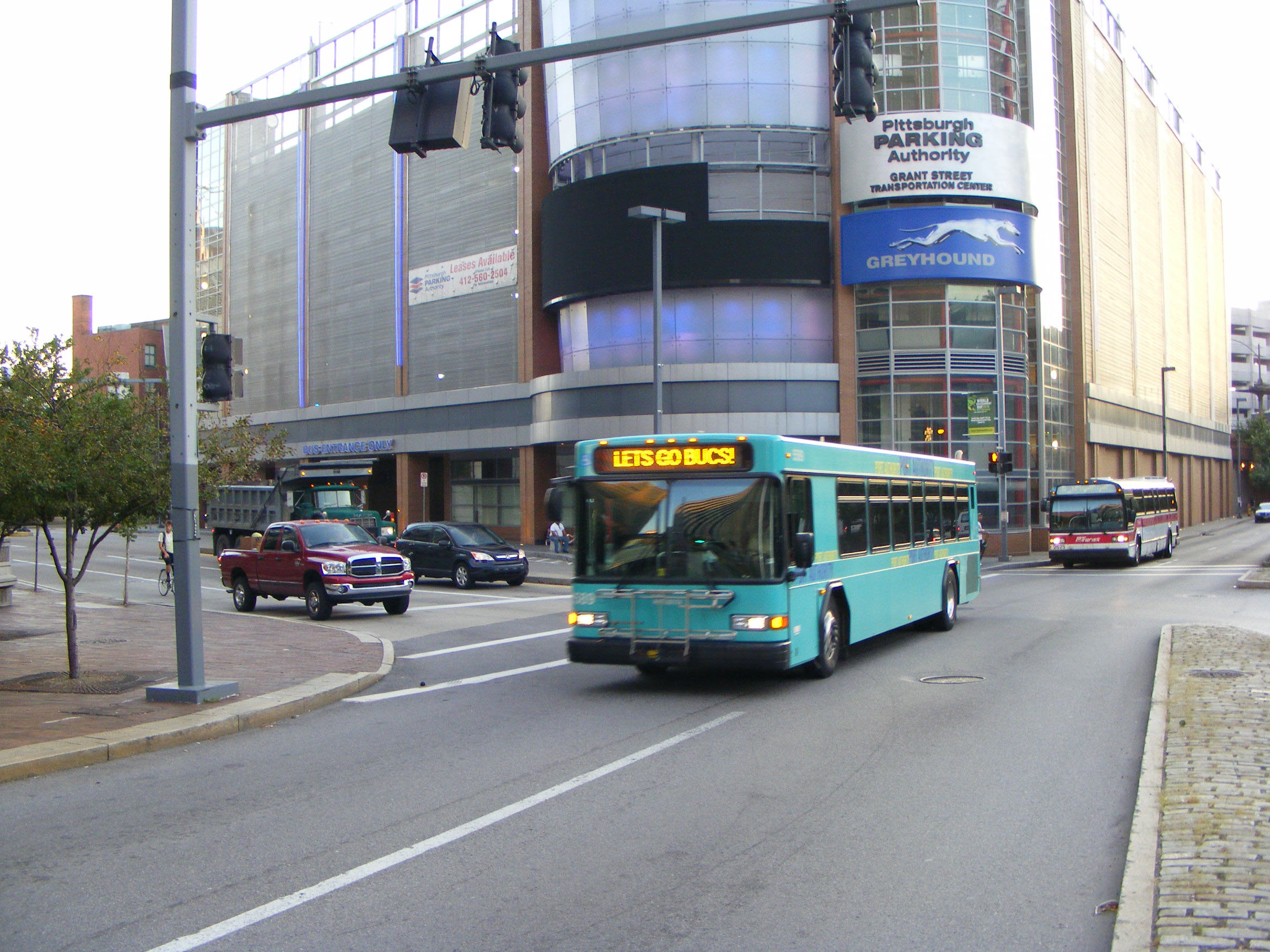 The same bus is seen again a couple of days later arriving along Liberty Avenue by the Greyhound Terminal. Its "GO BUCS" destination is a message of encouragement to Pittsburgh Pirates the local Major League Baseball club. The Pirates are often referred to as the "Bucs" or sometimes the "Buccos", derived from "buccaneer", an alternative name for a pirate. |