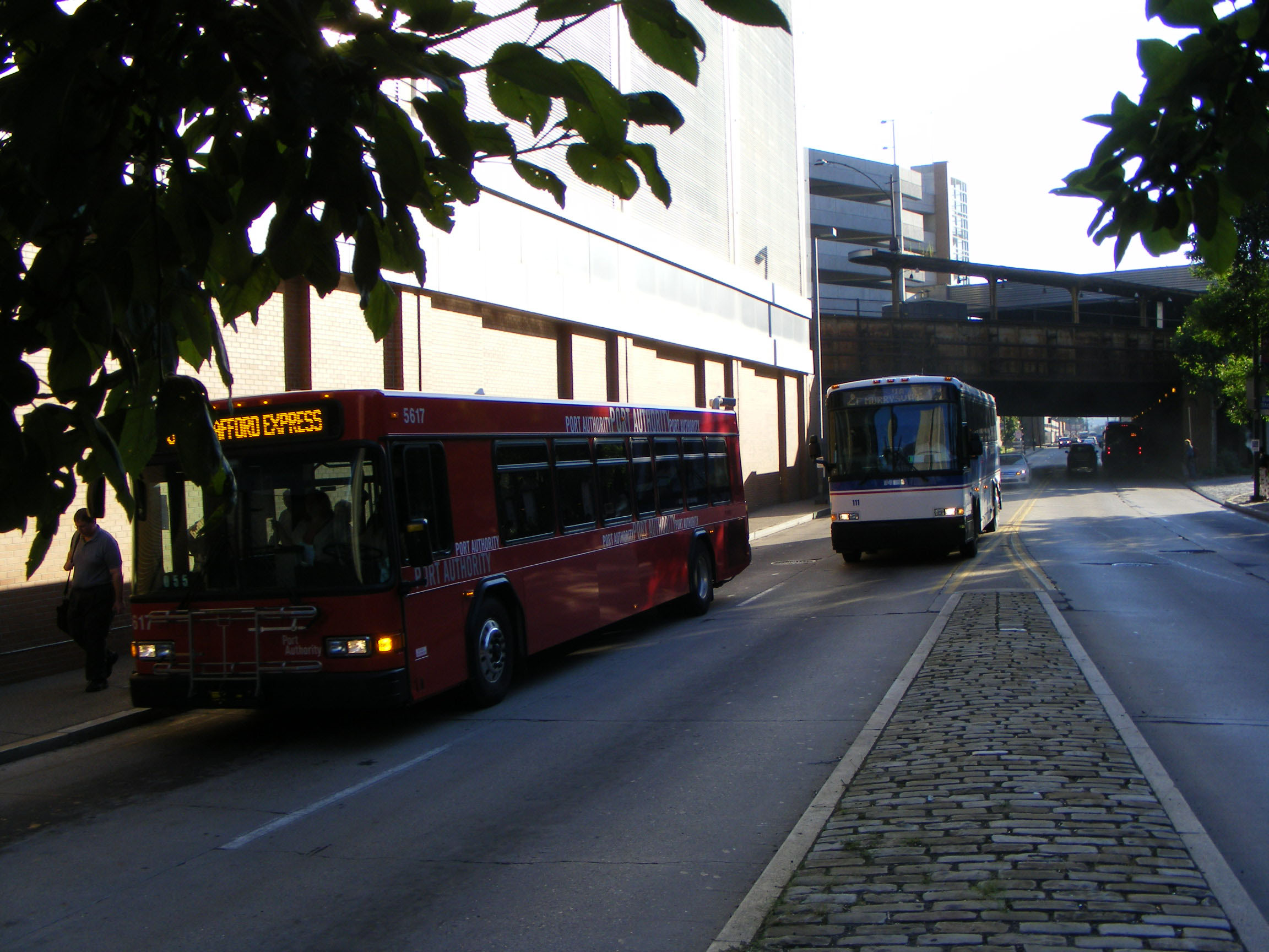 Here 5617 is seen again in the morning rush hour entering the city on Liberty Avenue, pursued by a Westmoreland Transit MCI commuter coach. |