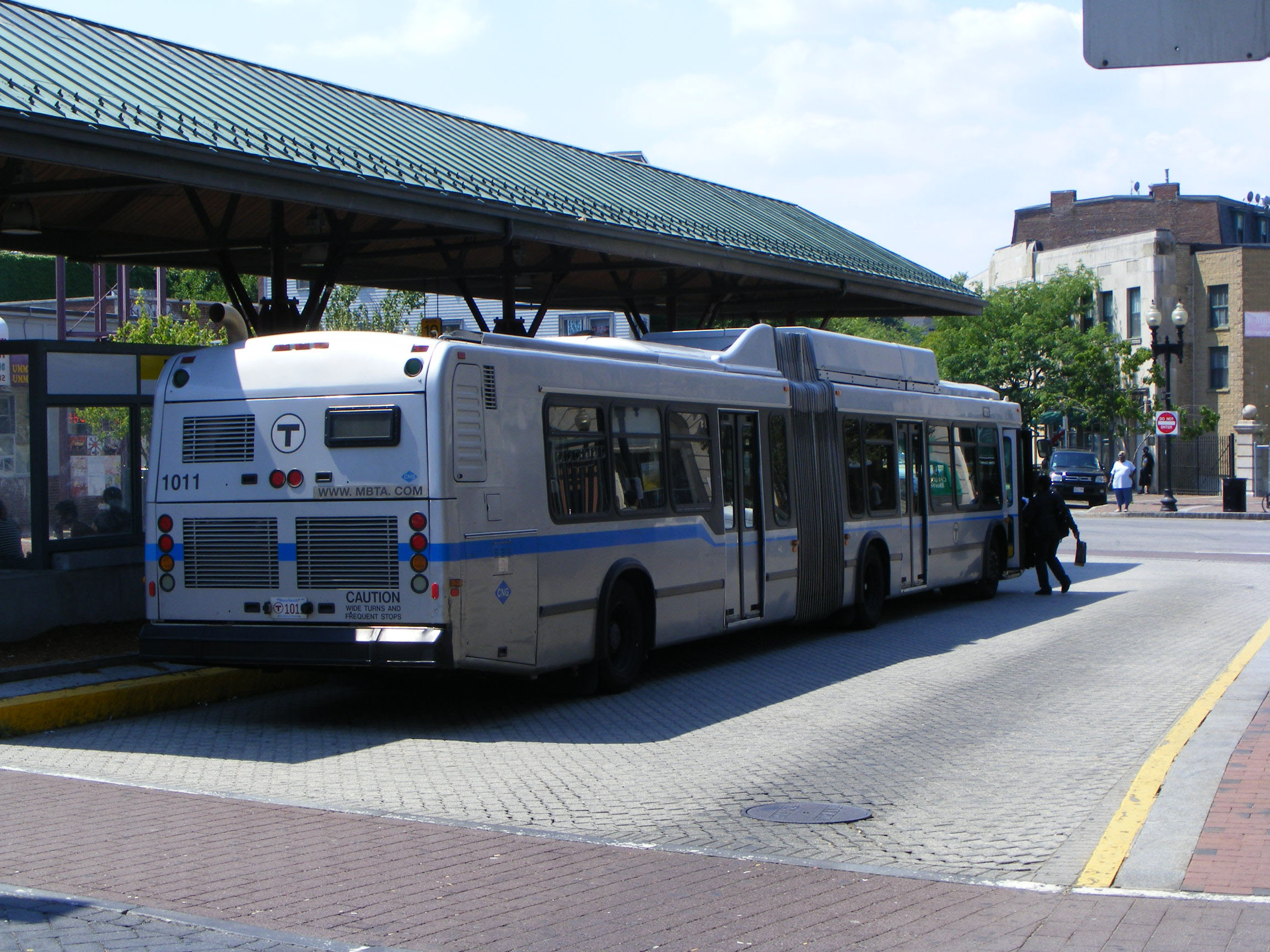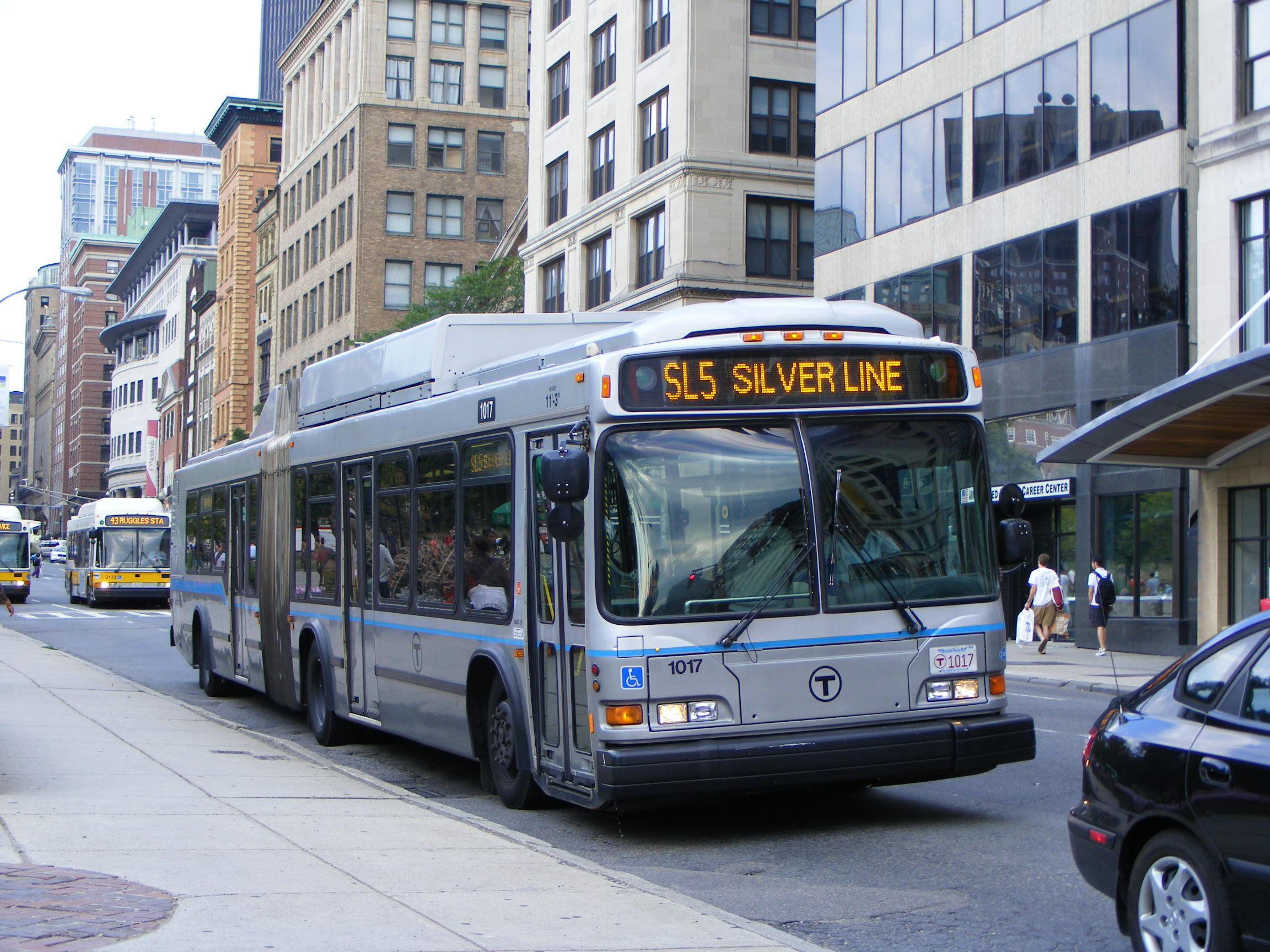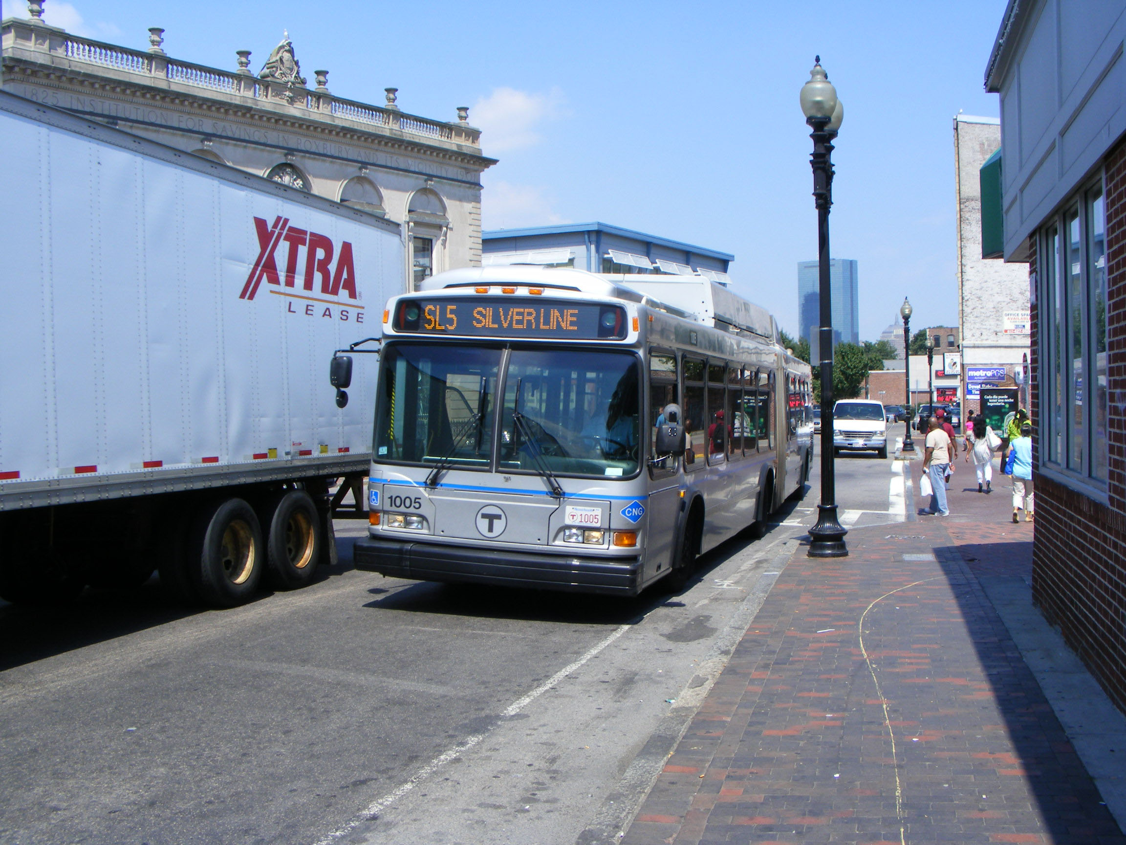 Silver Line services SL4 and SL5 link the downtown area with Dudley Station. CNG powered Neoplan AN460LF 1005 is seen midway to Dudley.