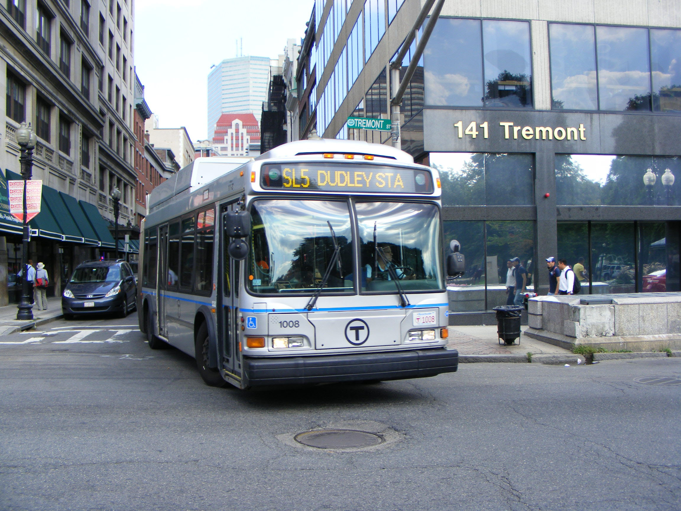 Turning on to Tremont Street opposite Boston Common is Silver Line Neoplan 1008.