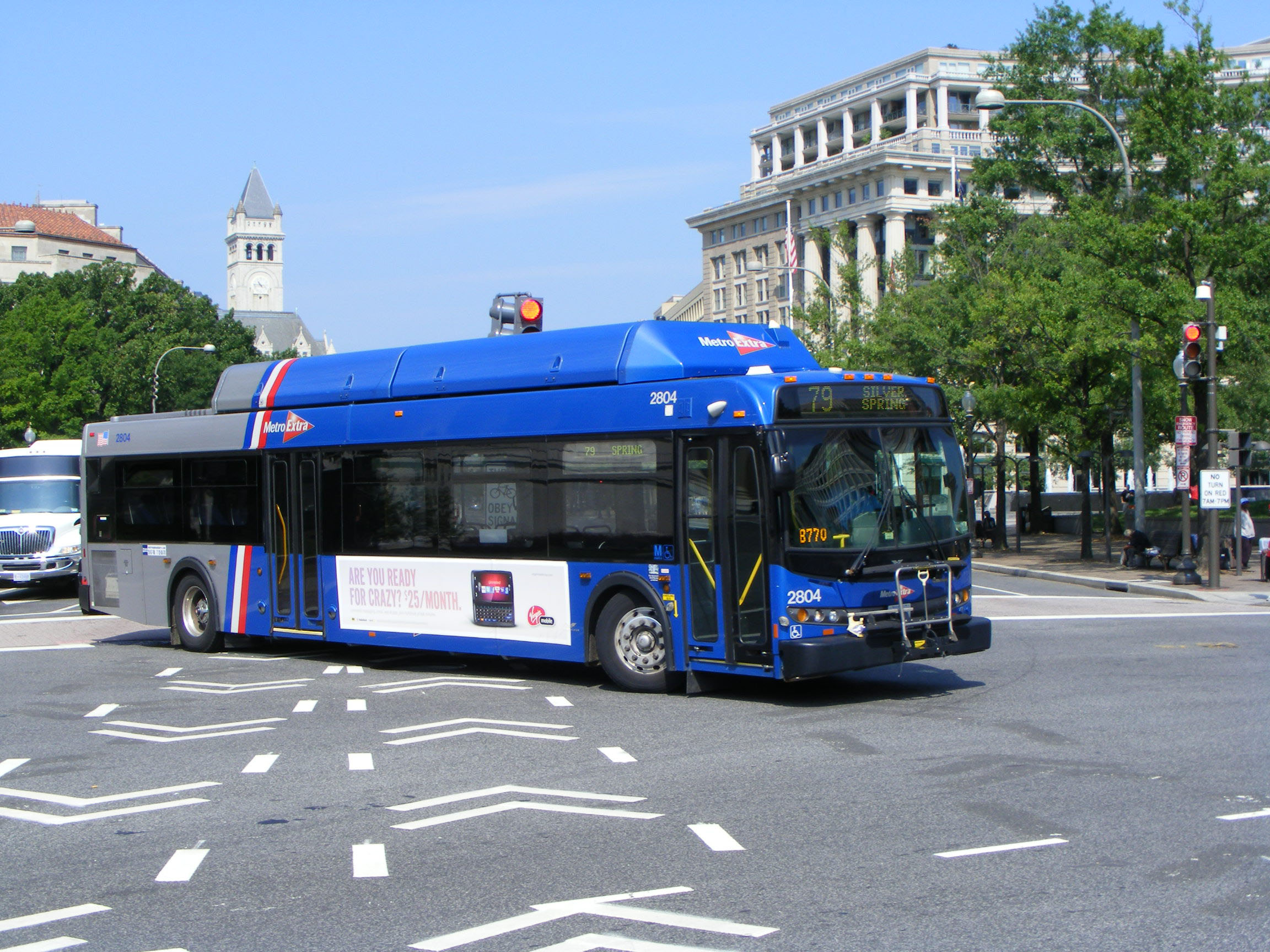 After the huge intake of C40LF buses, WMATA bought no vehicles until 2005 when ut switched to CNG powered Orion VIIs, followed in 2006 by Hybrid New Flyers, returning to CNG powered New Flyers in 2007 with 25 C40LFR models incuding 2804 seen in the special livery for Metro Extra branded services, like the 79 to Silver Spring, about ten miles out.