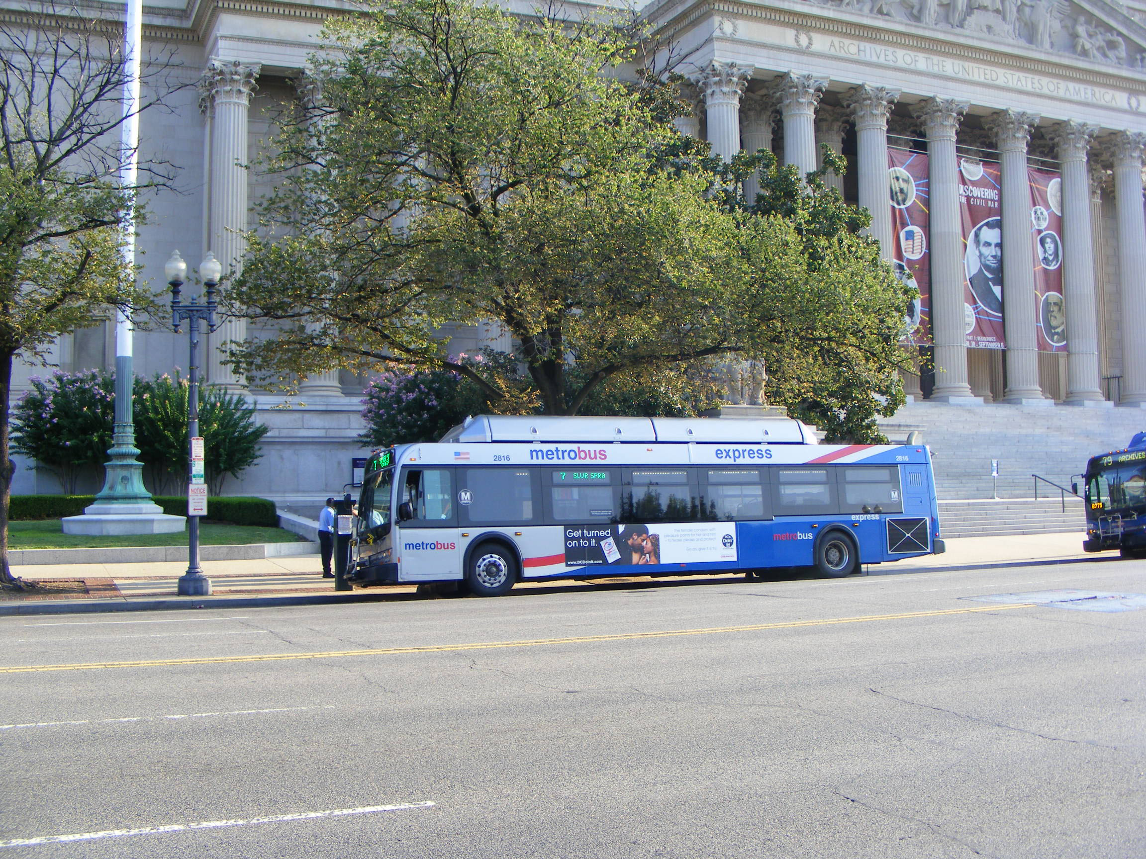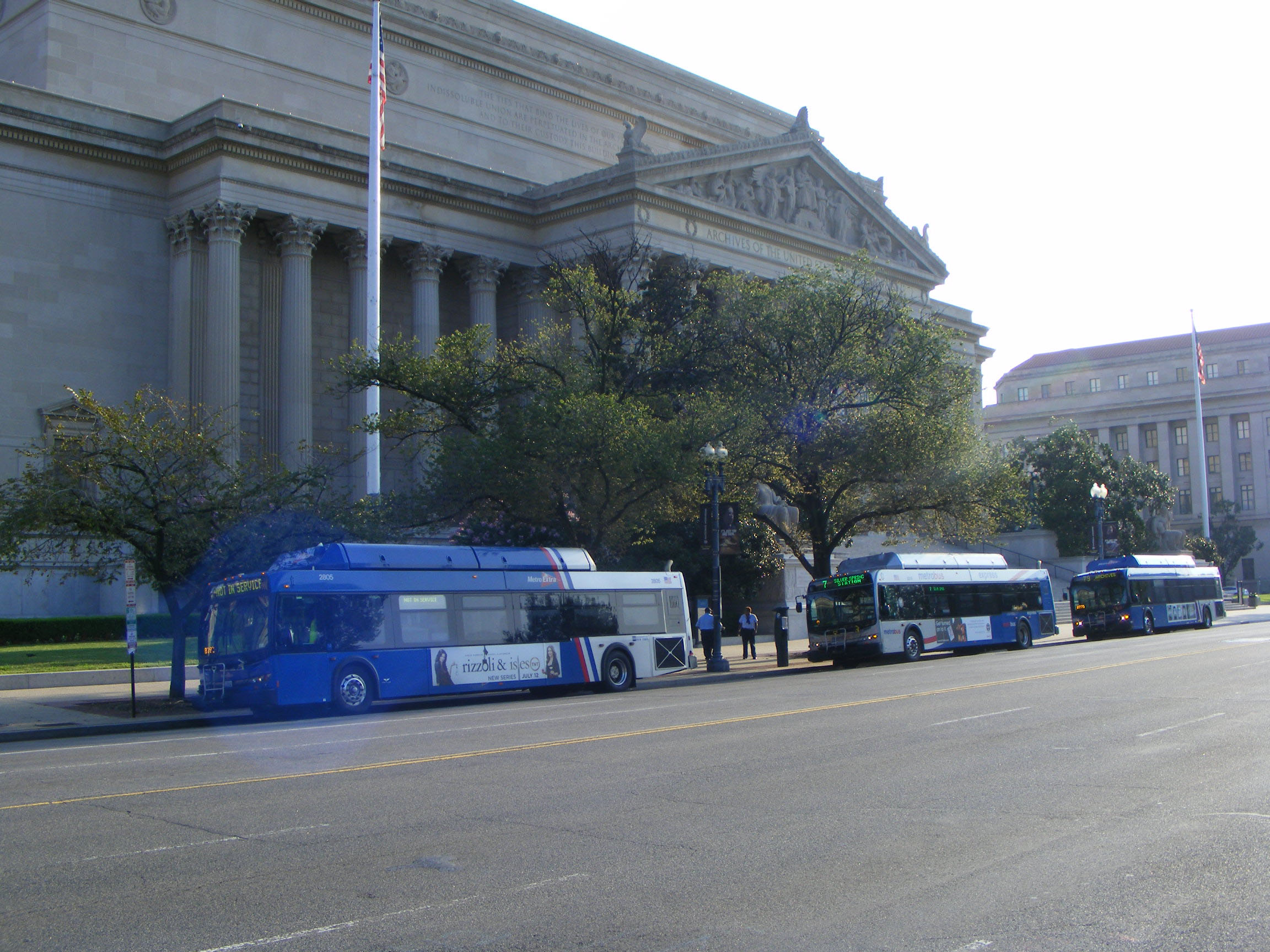 A trio of C40LFR buses outside the National Archives Building on Pennsylvania Avenue in August 2010. In the lead is 2805, behind in a different livery is 2816, but the end vehicle is not identified.