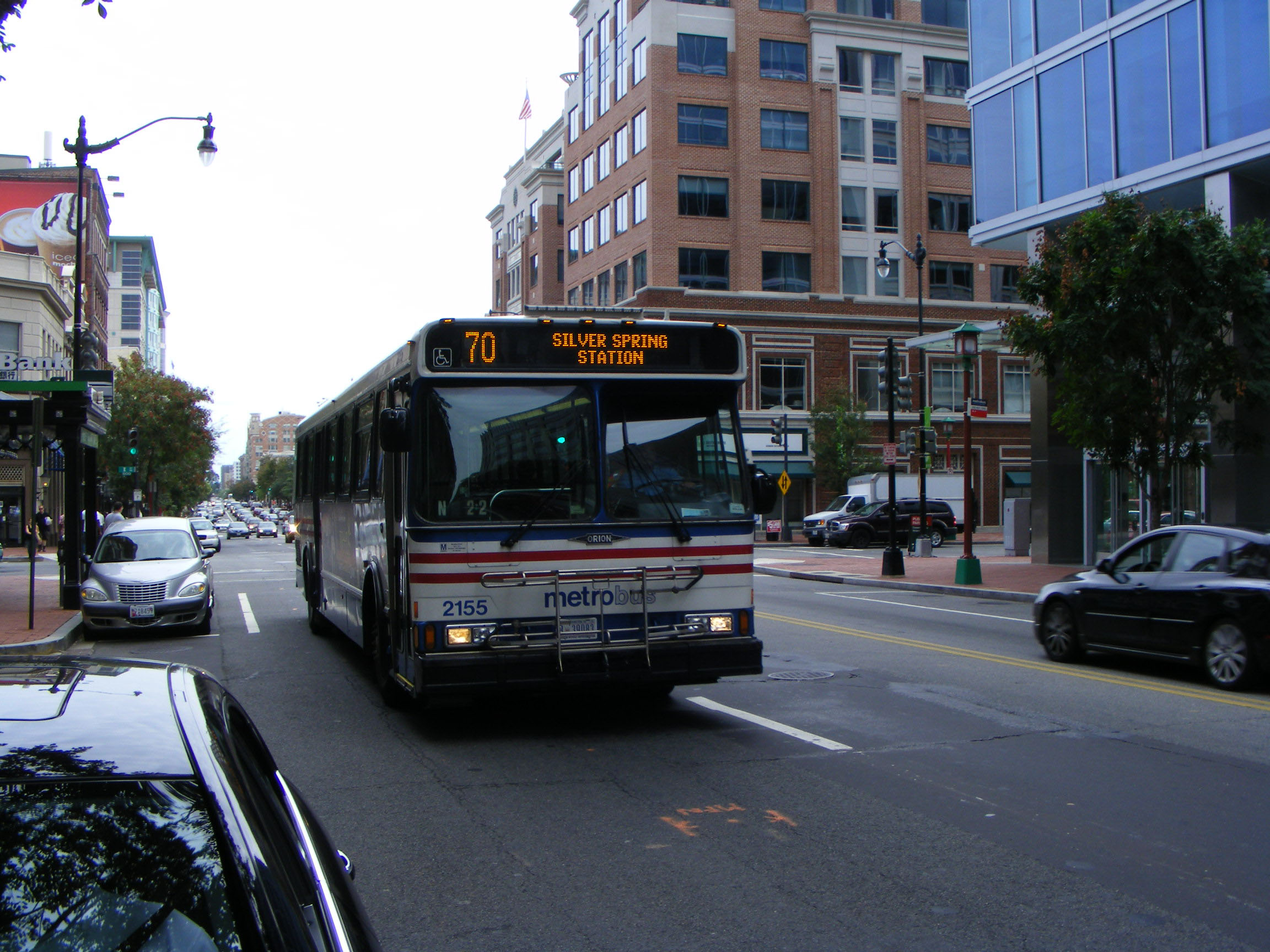 No less than 132 Orion V buses were delivered in 2000, 2100-2231. This is 2155, seen in August 2010, on the 70 to Silver Spring Station.