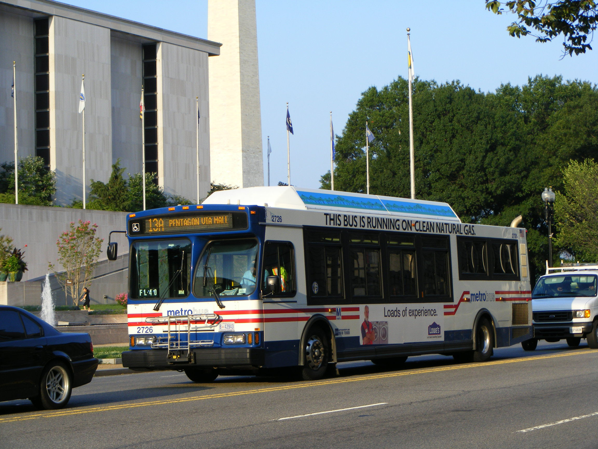 Deliveries of the box like Orion VII were greener machines. This bus, 2726, is CNG powered and one of 250 delivered in 2005 and 2006: 2501-2685, 2701-2730 and 3001-3035. The Washington Monument obelisk can be seen behind the bus.