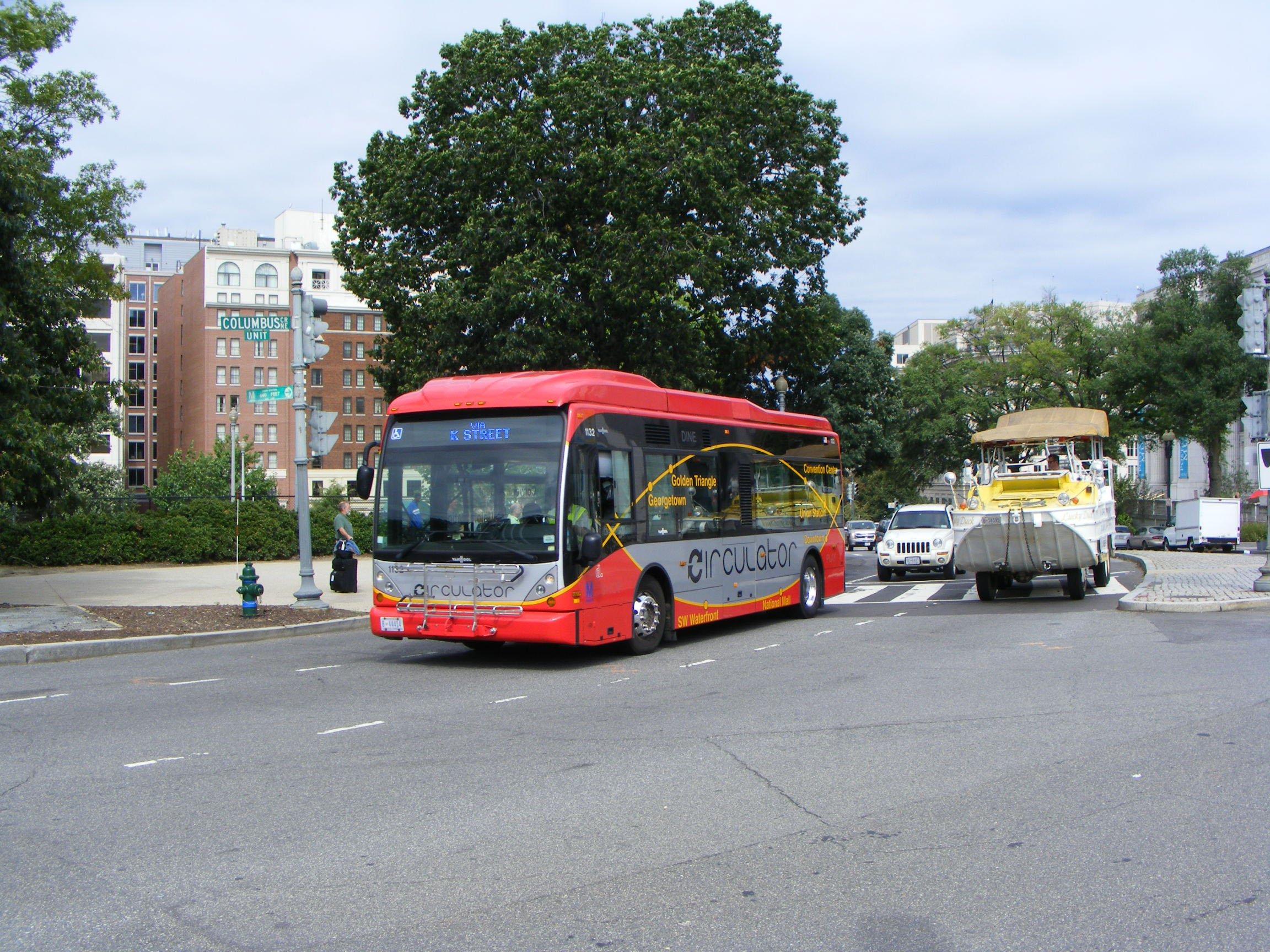 Tourists are well catered for transport-wise in DC, not only the usual collection of competing open top tours, but bus trains, mock cable cars and the inevitable DUKW tour, as this tub passing Van Hool A330K 1132 shows.