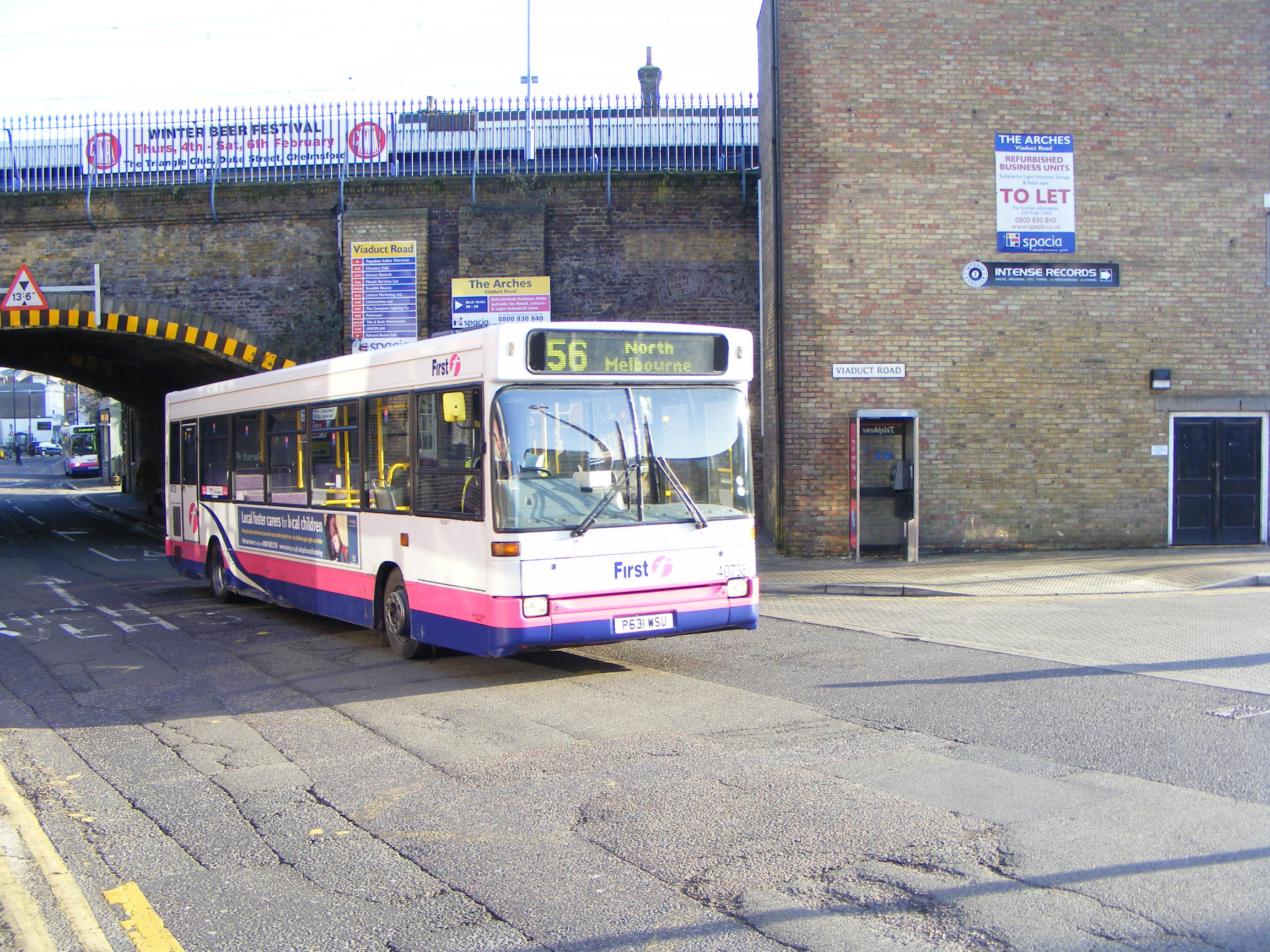 Seen in Chelmsford in 2010 is similar 40738 (P631WSU), but this bus was new as MD24 with Kelvin Central in Scotland. Its livery was once dubbed Barbie 3, when the Barbie 2 scheme was ditched in favour of greater uniformity. The difference being a barely noticeable shorter length of willow leaf on the side. ![]() |