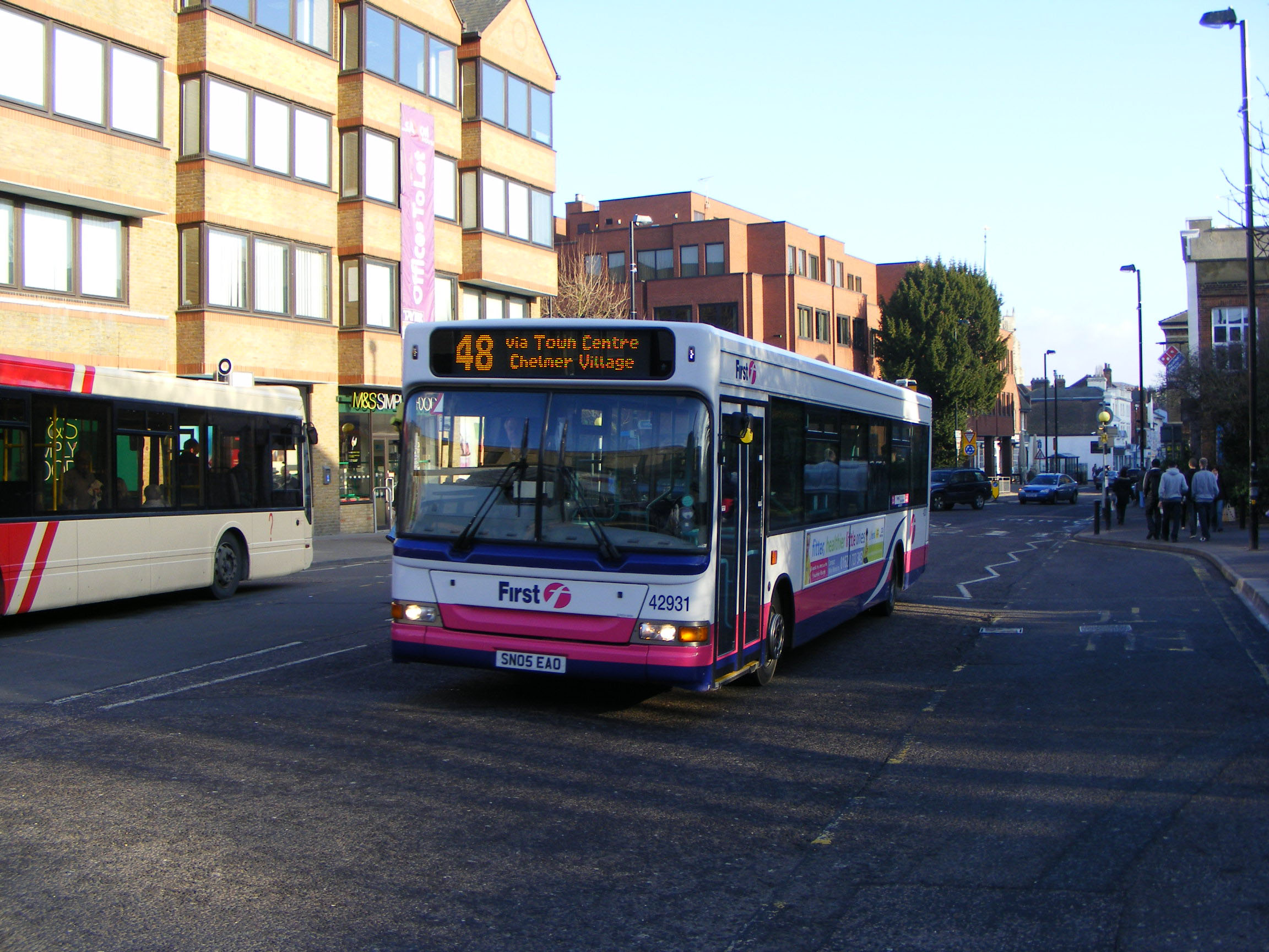 A contrast in Chelmsford Bus Station as former First West Yorkshire Alexander Dash bodied 47252 (M450VWW) passes Transbus Dart SLF 42485. ![]() |