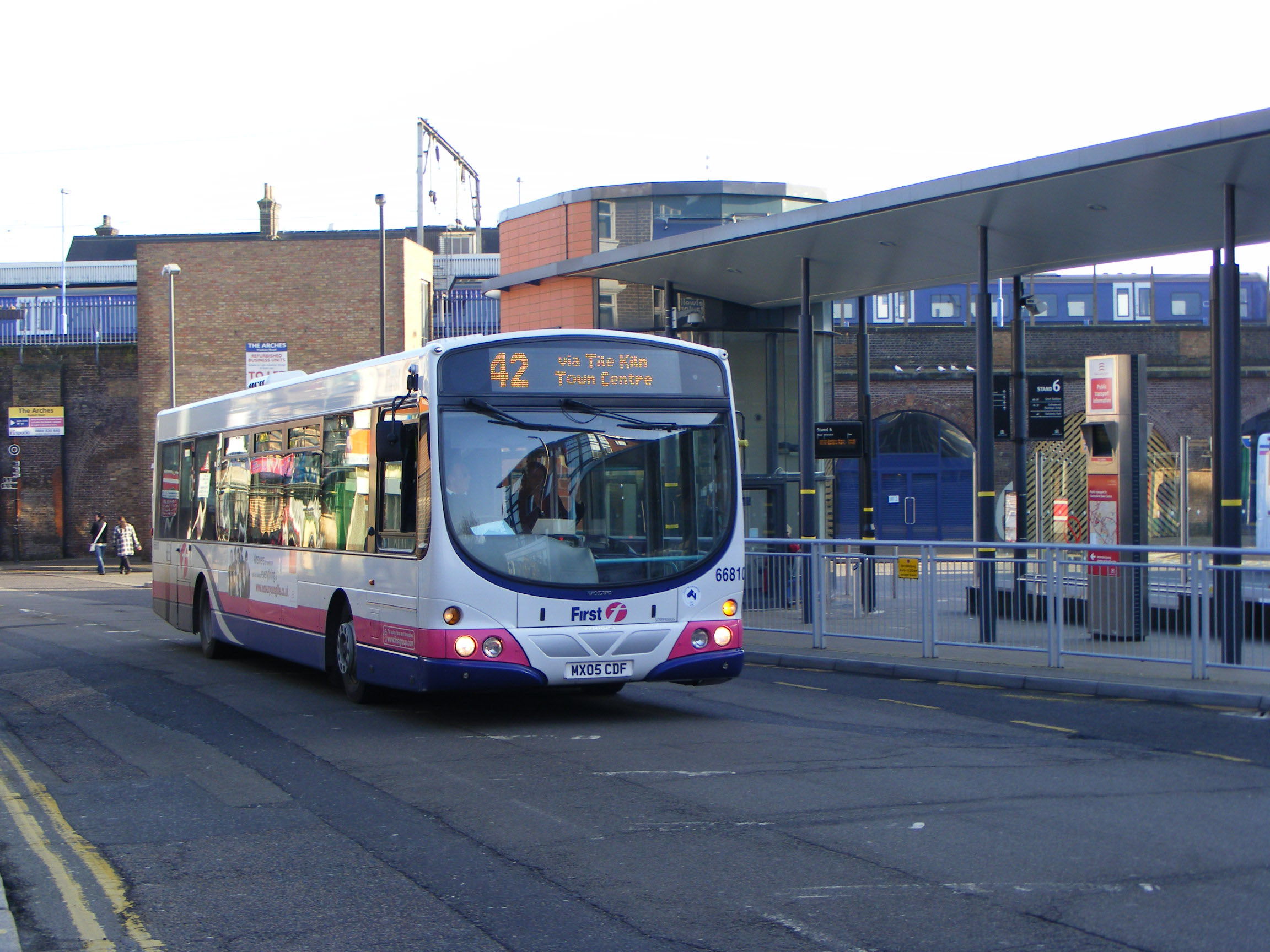 Definitely no doubledeckers are going to get under the 3.8m bridge at the northern entrance to Chelmsford's Bus Station. It has probably claimed some roofs over the years, indeed it may have damaged some singledeckers if they failed to take a centre path under the railway lines. Learning how to avoid that is the driver of trainer bus 66860 (MX05CHY), a Wright bodied Volvo B7RLE new to First Manchester. Heading into the tunnel is Enviro200MMC 44660 (YX66WBE).