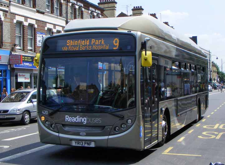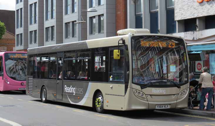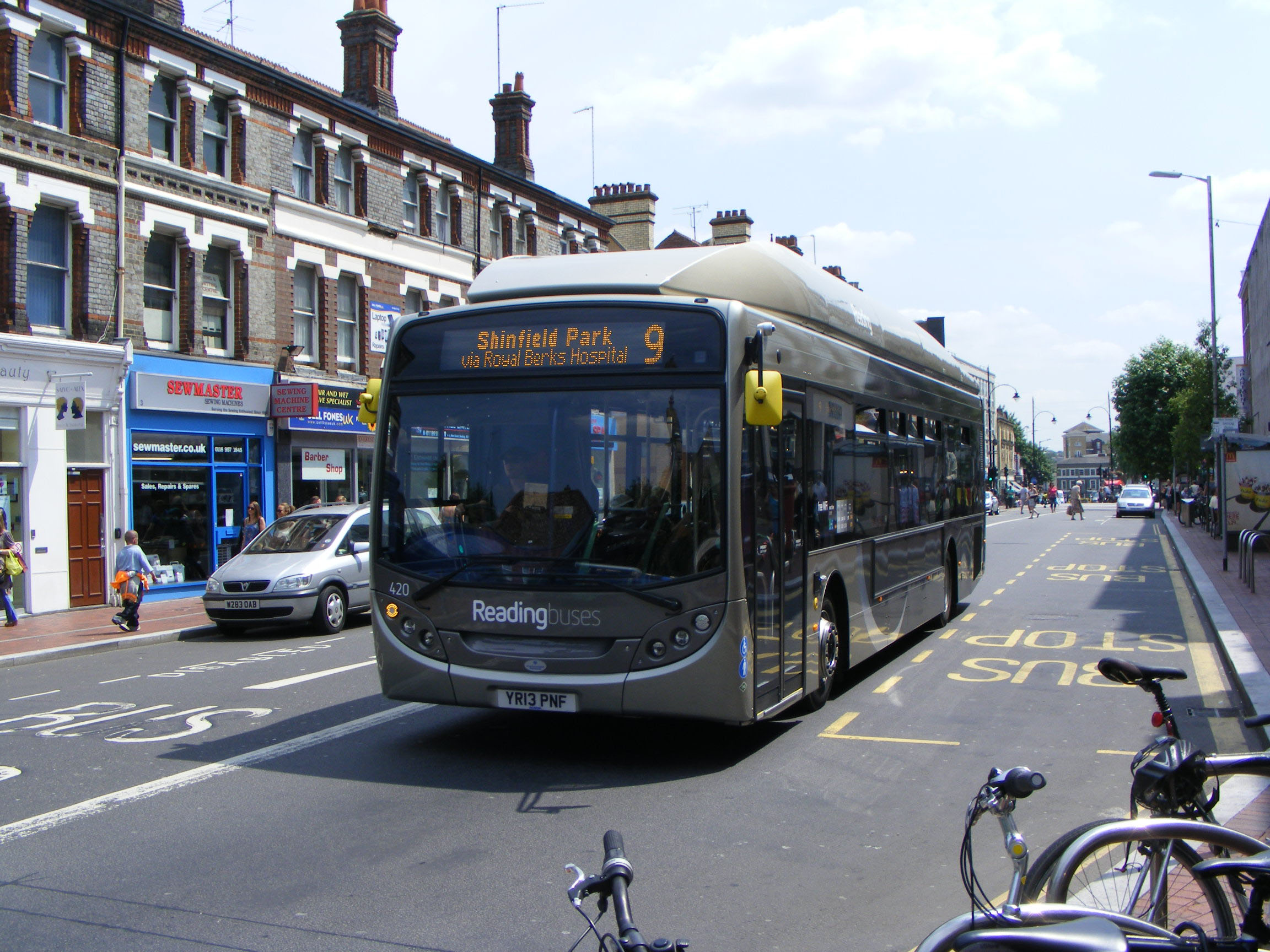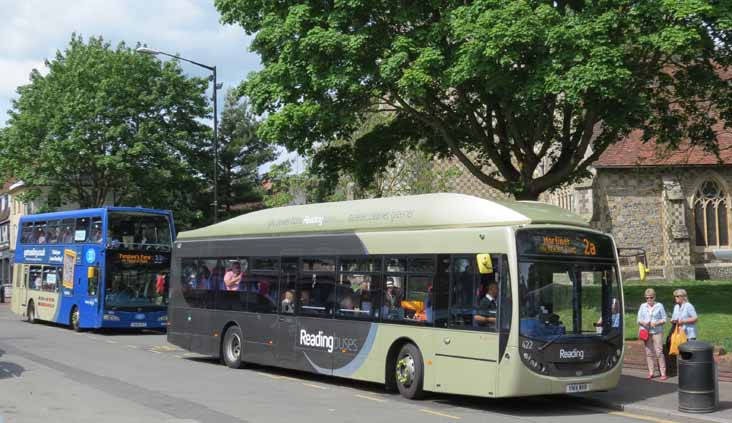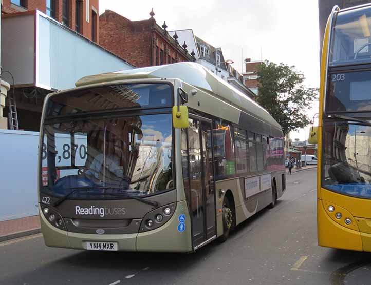The new gas powered Reading Buses fleet includes some in generic route colours like 422 (YN14MXR). The Scania K270UB chassis have Alexander Denning Enviro300 bodies with a housing for the gas pod designed by Ray Stenning of Best Impressions, who is also responsible for Reading's livery designs and marketing. The bus is seen outside St Mary's in May 2015.