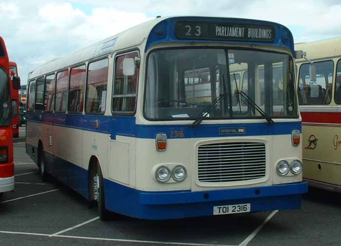 Preserved on the mainland is Ulsterbus Bristol RELL6G 2316 (TOI2316) with distinctive Alexander (Belfast) bodywork. The Ulster twin fleets built up a large contingent of REs and persuaded British Leyland to continue supplying them as an "export" chassis for some years after RE sales in the UK had been cut off in favour of the Leyland National. The bus is seen at the 2007 North Weald event. |