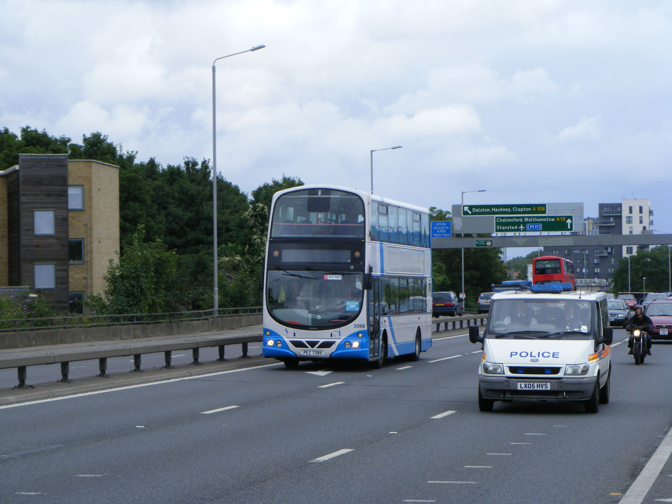 Volvo 2224 (OEZ7224) is slightly older than the others, a 2007 delivery. It is seen heading south on the A12, probably heading to the London Exhibition Centre, followed by a Stagecoach Enviro300. |