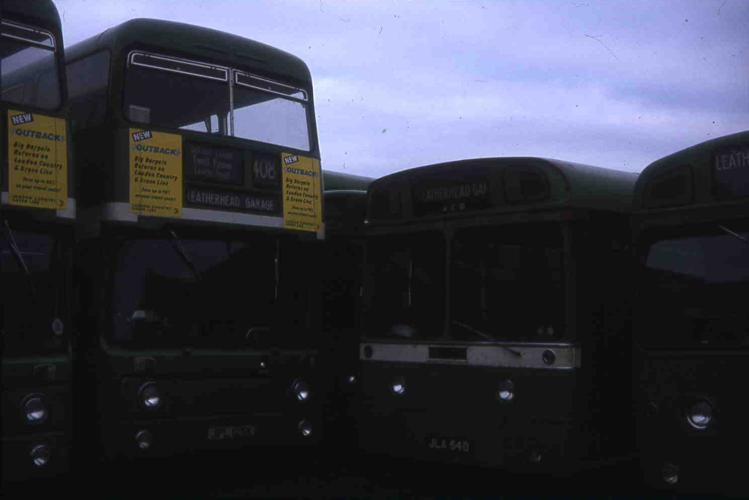 At Leatherhead depot sometime between September 77 and June 78 are two Park Royal Atlanteans and two AEC Merlins. Easily identifiable are AN25 (JPL125K) and MBS4 (JLA54D), the latter originally Strachan bodied Red Arrow Merlin Red Arrow XMB4. It was the second Strachan bodied Merlin to be painted green. When new XMB1 (JLA57D) was allocated to Reigate and ended up in Tring for its 387 town service, but in 1973, by then renumbered and re-registered MBS15 (SMM15F), it was swapped with MBS4.