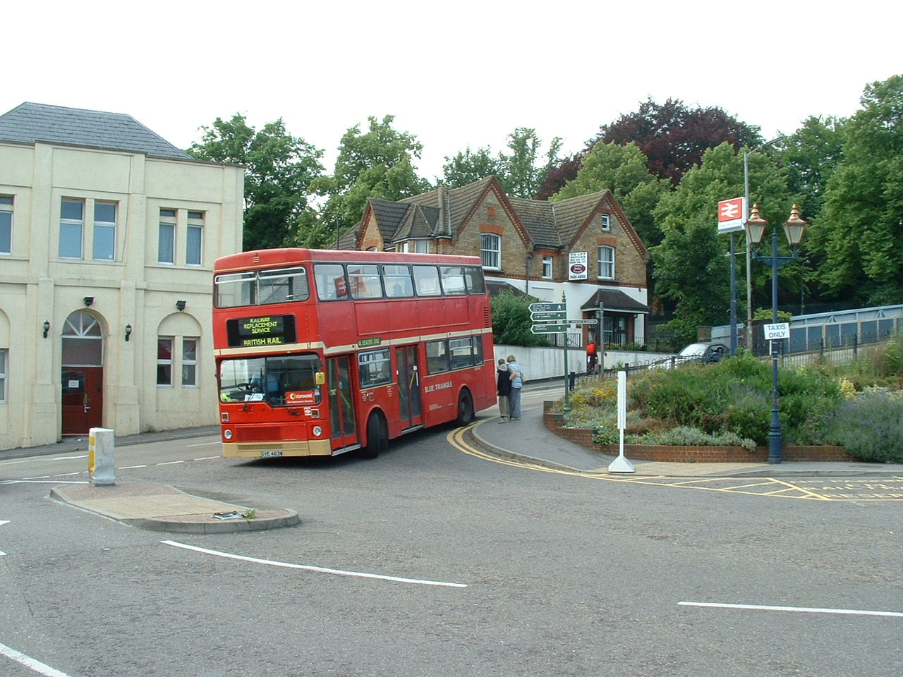 Some may recall the collapsing Tesco store disaster at Gerrards Cross. The controversial store was being built over the local Chiltern Trains line into Marylebone, when the structure collapsed. This put the line out of use for some months occasioning substantial loss of business payments to the railway from the store developers. It also put a lot of money into the pockets of various bus companies providing replacement bus services. Former LT M809 (OJD809Y) is seen at Wycombe Station. |