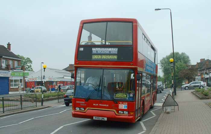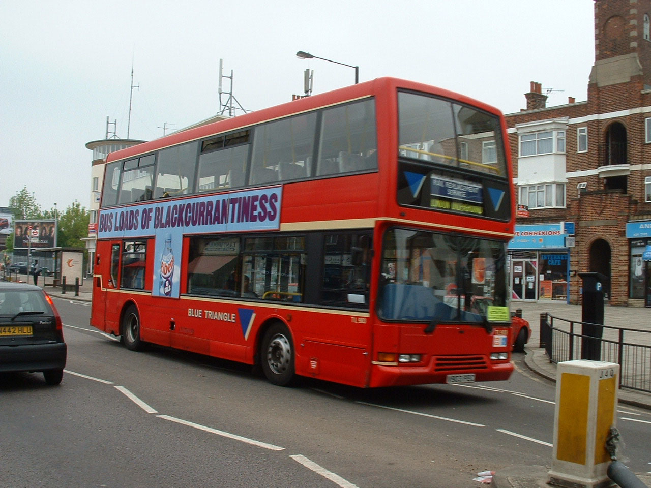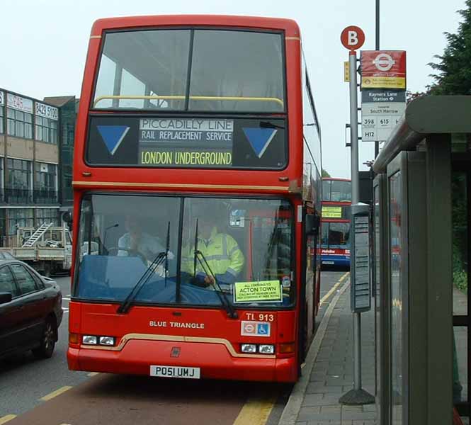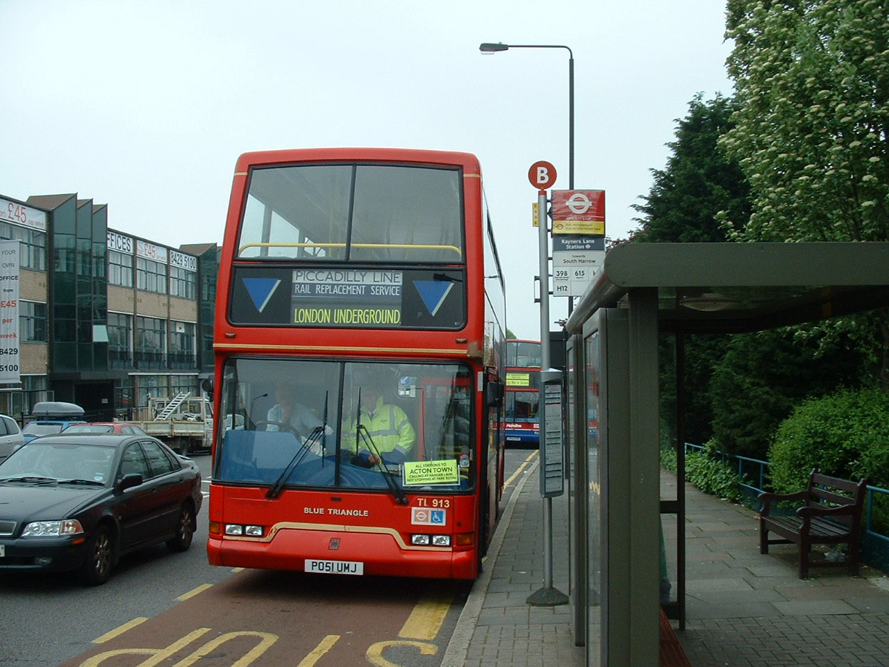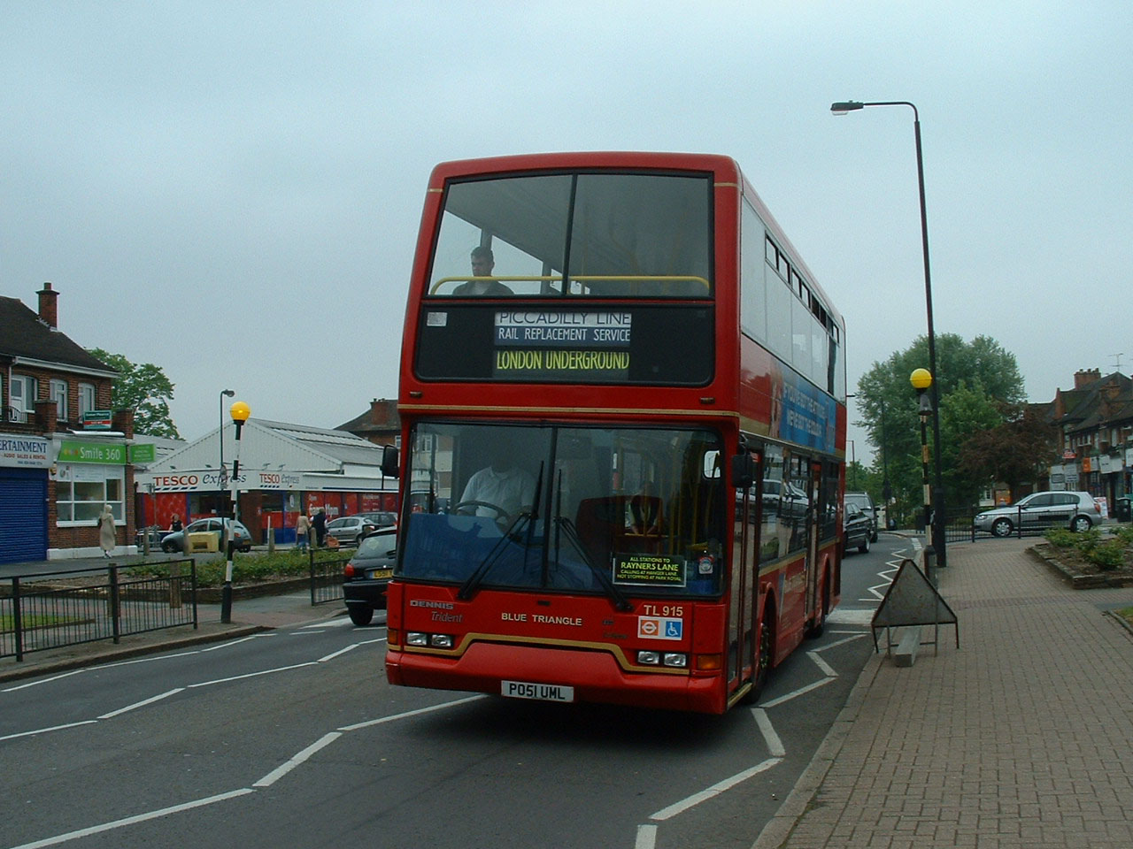 TPL924 has acquired the registration from RM110 (VLT110). It is seen in the centre of Heathrow in May 2004 on Piccadilly Line tube replacement services. The bus is from a batch of Plaxton President bodied Tridents.