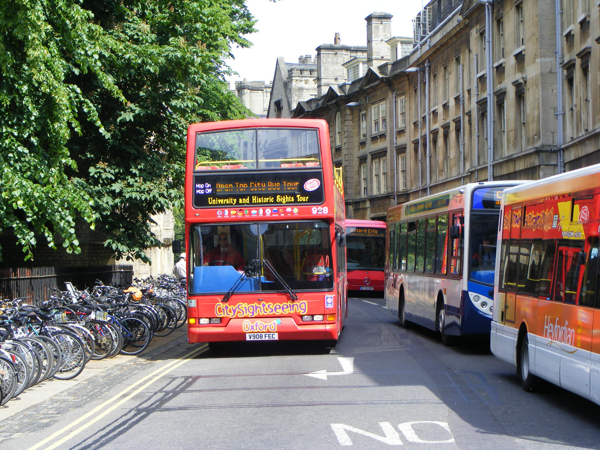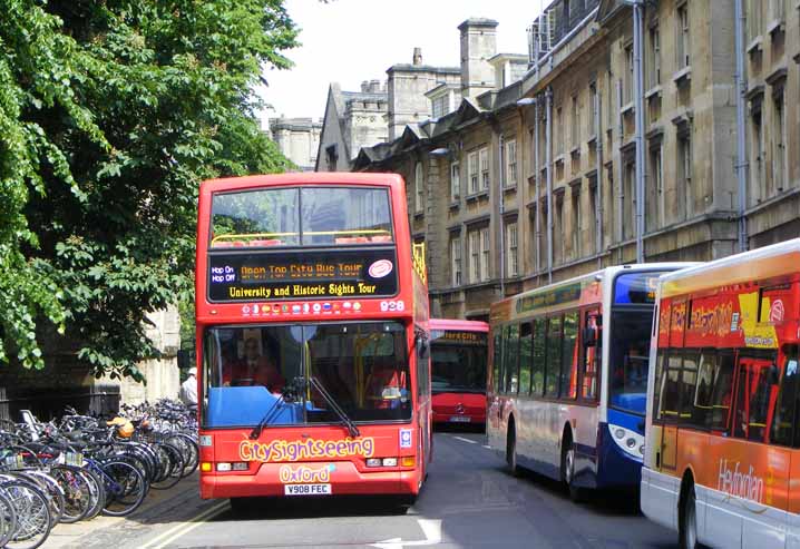 Seen in all the best company - 908 (V908FEC) passes a Heyfordian Solo, a Stagecoach Oxford MAN and Oxford Citaro in St Giles.