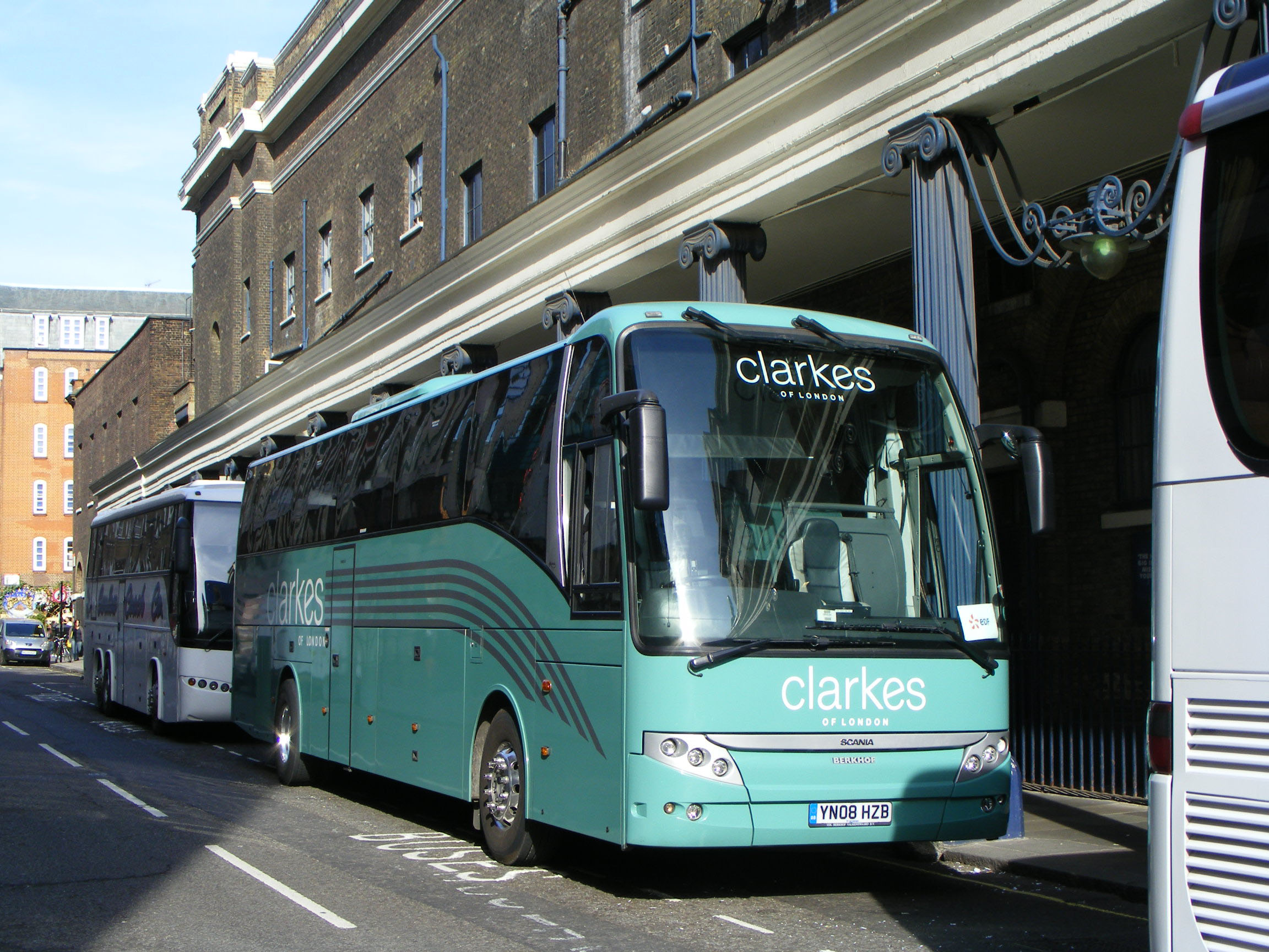 A less common member of the Clarkes fleet is this Berkhof Axial bodied Scania K340EB, YN08HZB. It is seen round the back of Covent Garden in September 2011.