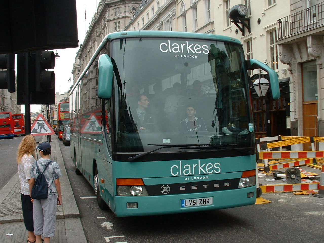 In contrast a new S315GT-HD Setra is seen in the new thin stripe livery at Heathrow in February 2005.