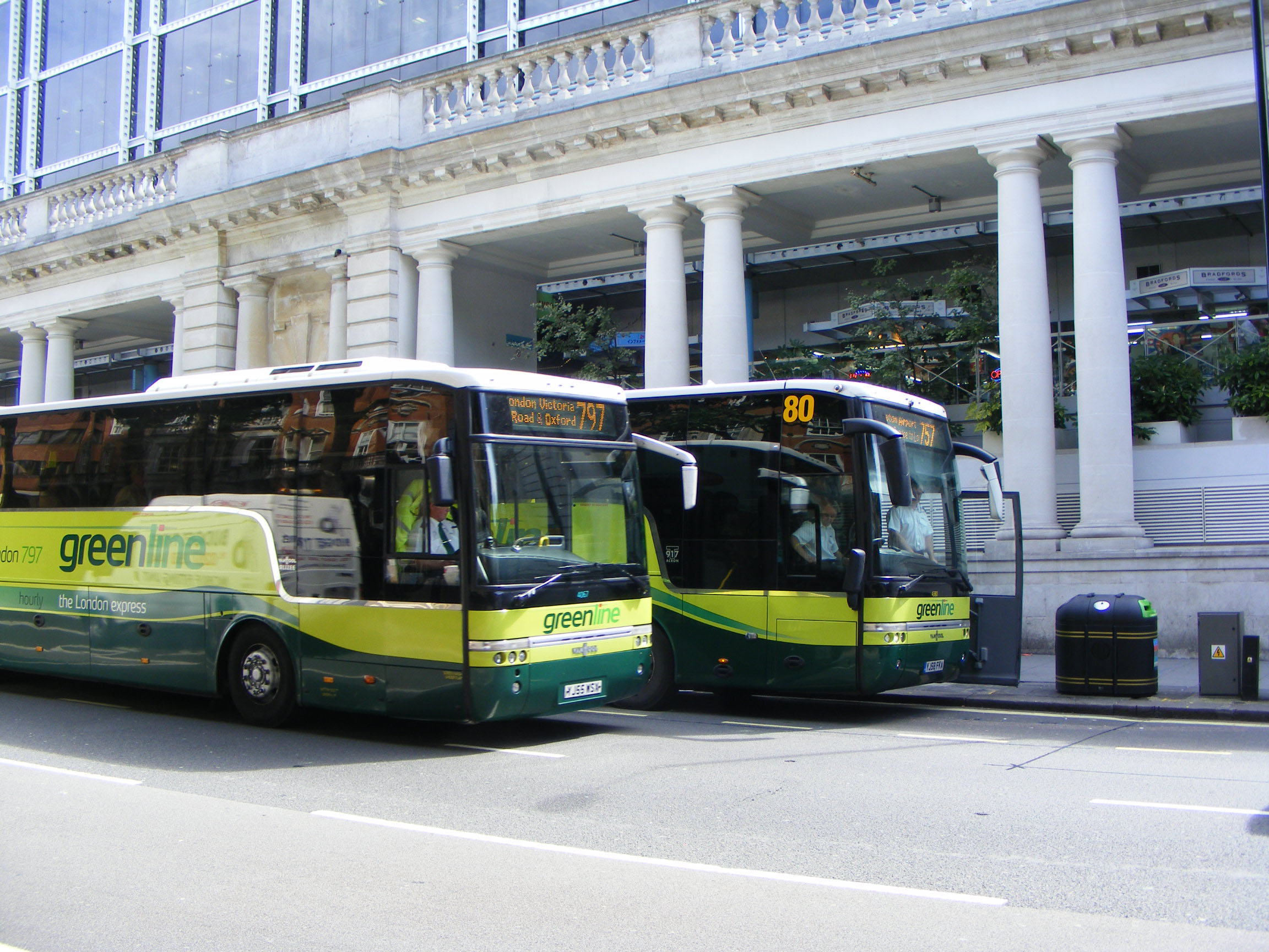 Old meets new. DAF SB4000/Van Hool 4067 (YJ55WSX) passes 4380 (YJ58FKA) in the summer of 2012 in Buckingham Palace Road. Displaced off the 757 by the new Acrons, the DAF/Van Hools worked the 797 Stevenage express. Shortly after the photo was taken 4380 received the half Green Line half easyBus livery and the reliveried coach can be seen in the easyBus gallery. |