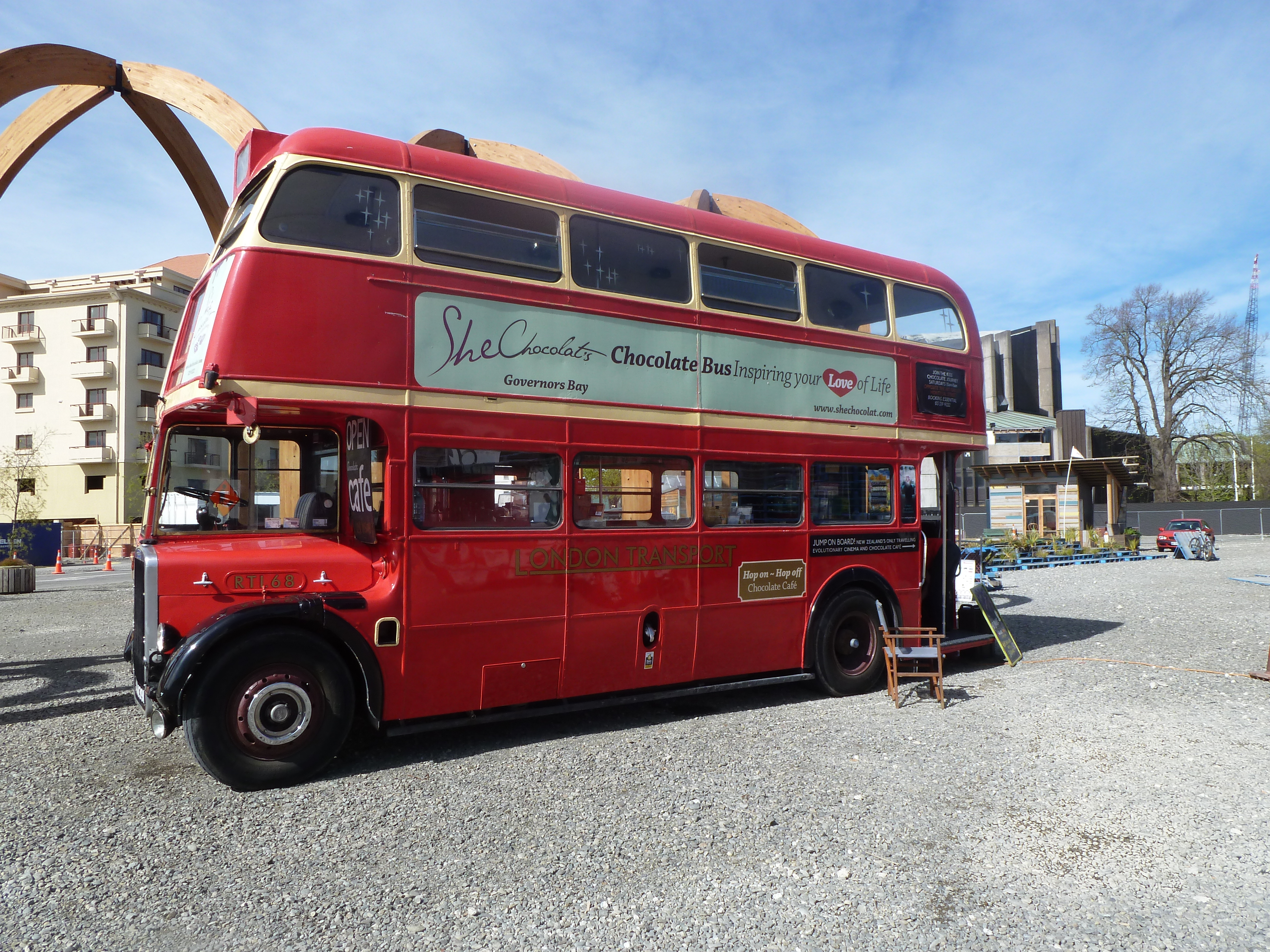 In the wake of Christchurch's earthquake a number of pop up stalls bridged the gap while reconstruction was taking place. Former RTL68 (JXN391), on its fourth Park Royal body, but first with a roof box fitted in 1964, is being used as the "Hop on Hop off Chocolate Cafe". The bus had left London Transport service for White City Coaches in 1968, passing to Ted Brakell for semi-preservation in 1974. It was not until 1993 that it headed Down Under. Picture courtesy of Wendy Farmer |