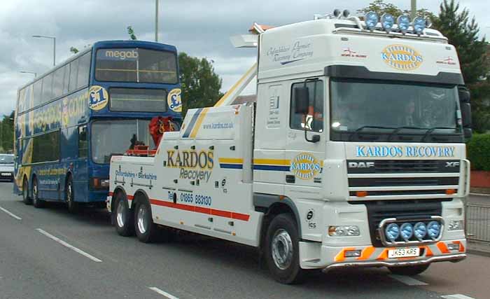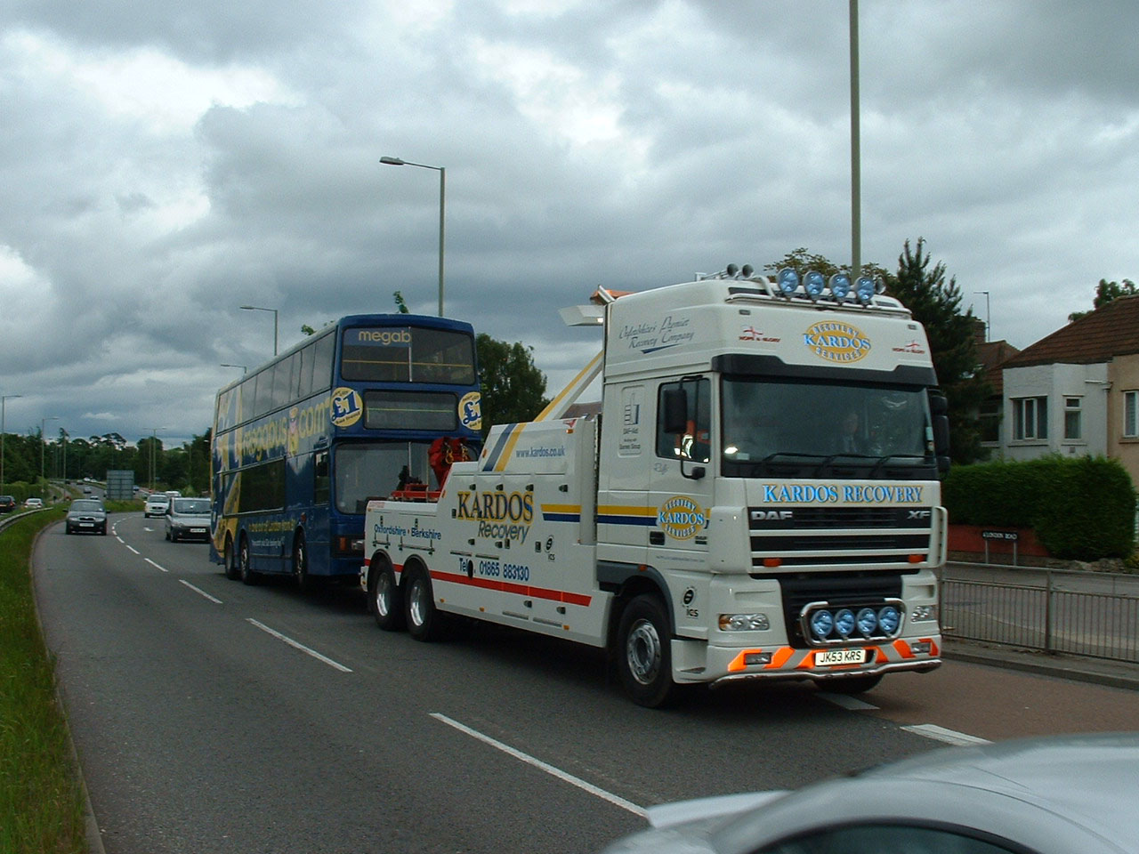 All was not well with this unknown Oxford based Leyland Olympian being recovered by a DAF wrecker at Headington roundabout in June 2005. It was not long after that the Oxford Megabus service was subsumed into the Oxford Tube, then recently equipped with new Neoplan Skyliners. Olympian 13601 continued working for Megabus on the London - Newcastle run. |