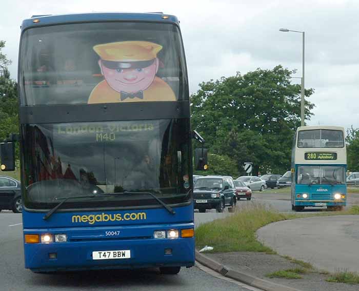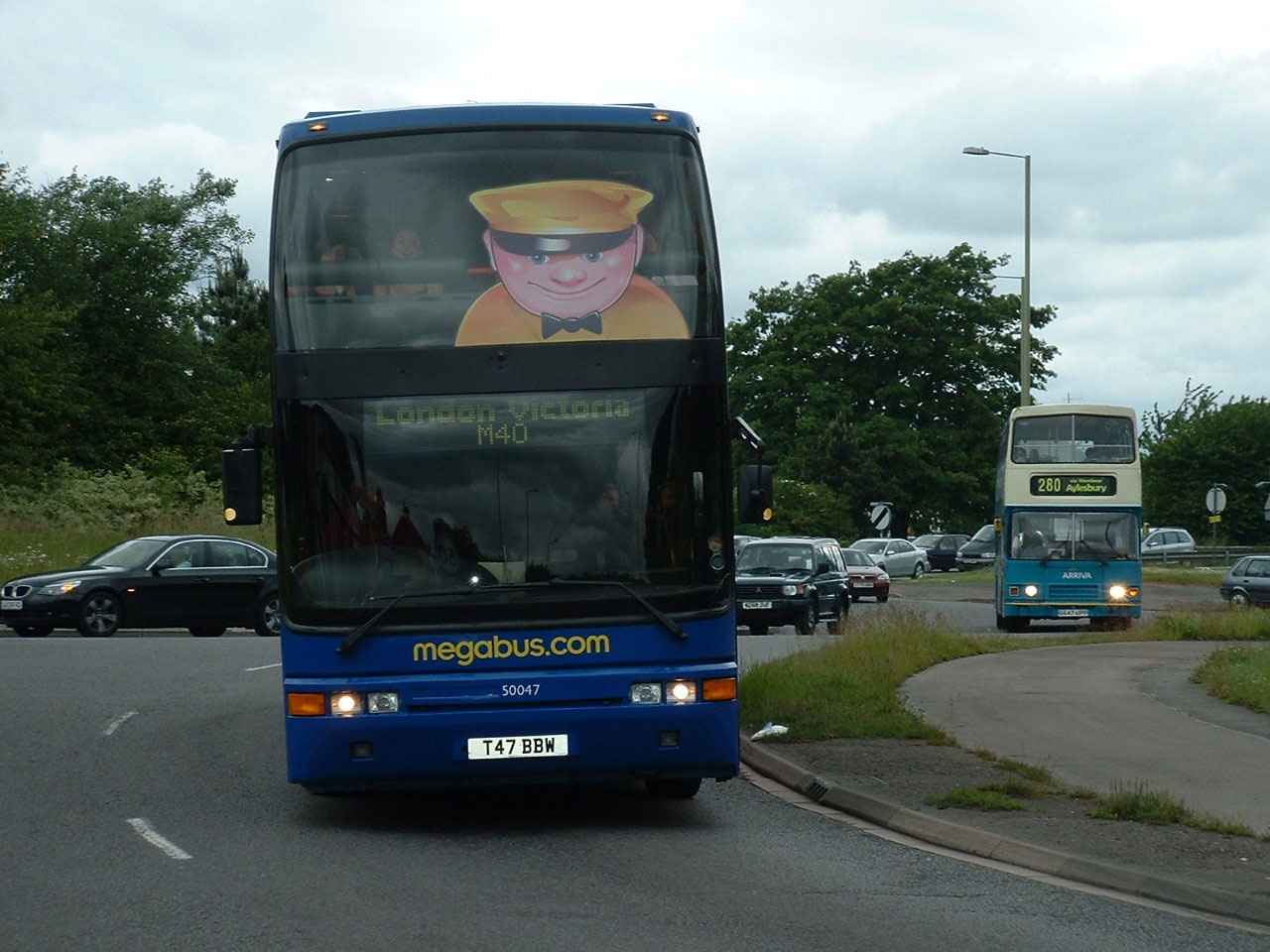 The MAN/Jonckheere Oxford Tubes displaced by the fleet of Neoplan Skyliners largely went on to Megabus duties. However 50047 is one of three that returned to Oxford in the early summer of 2005 to work Tube duties whilst the Neoplan fleet was sent away for modifications. The coach is seen at the Headington roundabout A40/Ring Road junction in Oxford. Bringing up the rear is an Arriva the Shires 1989 Alexander bodied Olympian delivered new to Luton & District on the 280 to Aylesbury. |