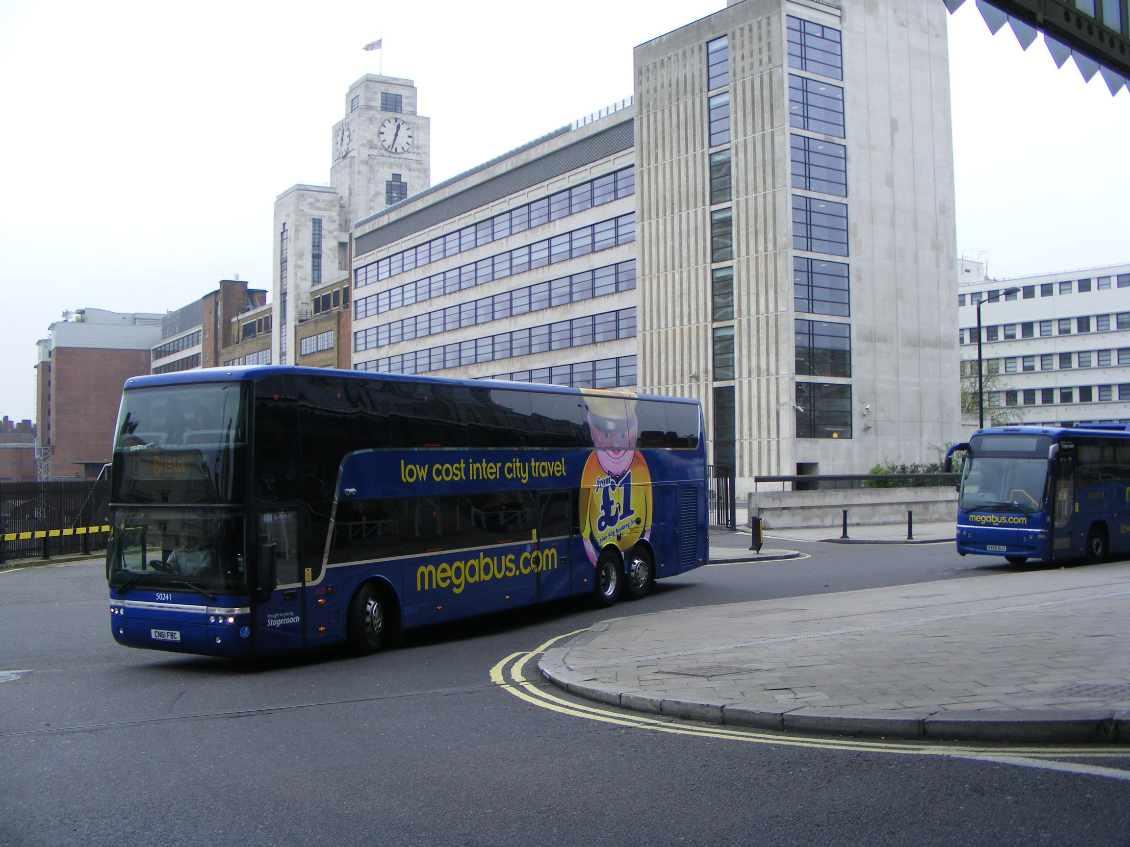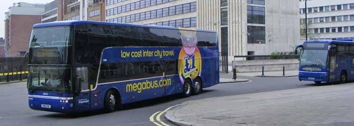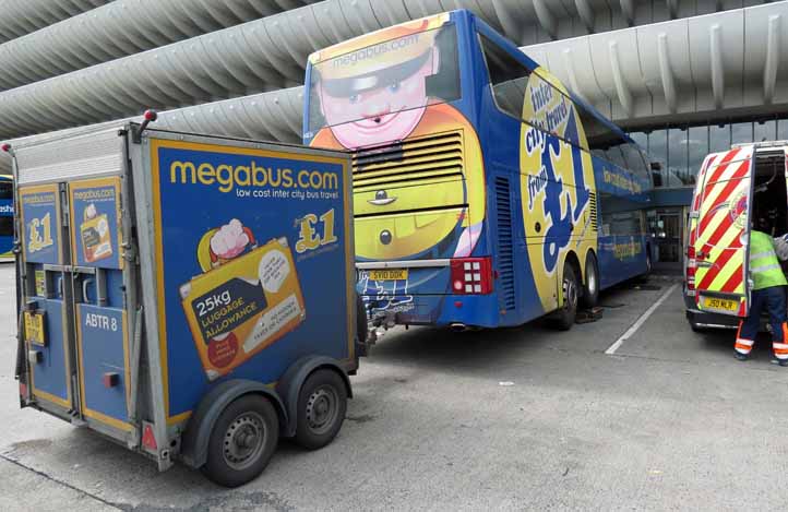 Sometimes not everything runs perfectly in the Megabus world and 50231 (SV10DDK) was receiving mechanical attention having failed in Preston Bus Station back in August 2014. Note the luggage trailer. Picture ref A4371 |