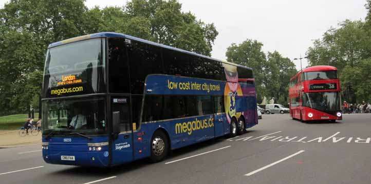 Megabus Astromega 50241 seen moving off from layover on Elizabeth Bridge in Victoria, London, leaving Volvo B12BT 54061 (KX59DLU) on station. |