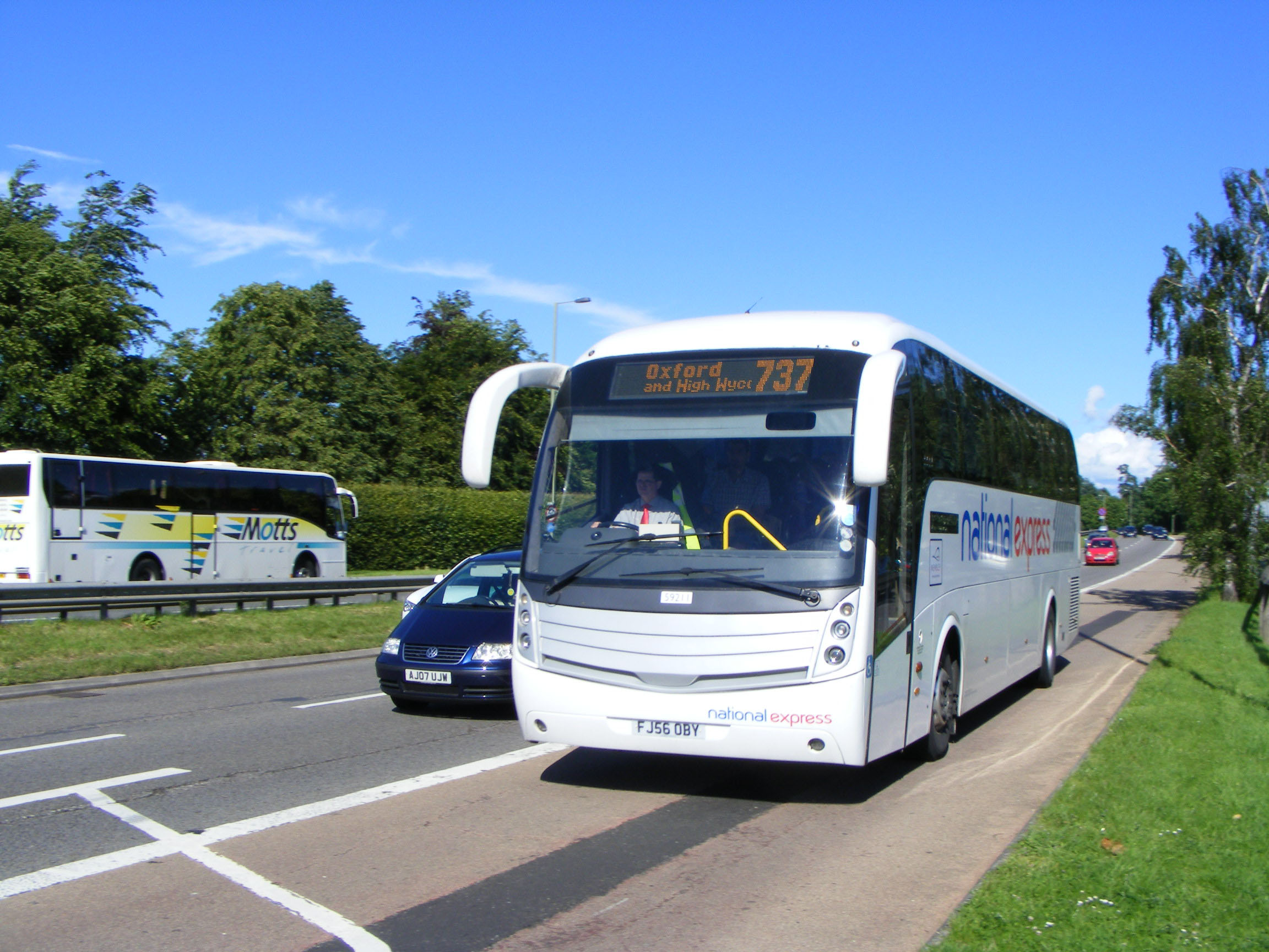 In the old National Express colours in April 2007 is Stagecoach Oxford Scania K340EB 59213 (FJ56OCA) about to rejoin the M40 at High Wycombe's Handy Cross junction on its journey from Oxford to Stansted Airport. |