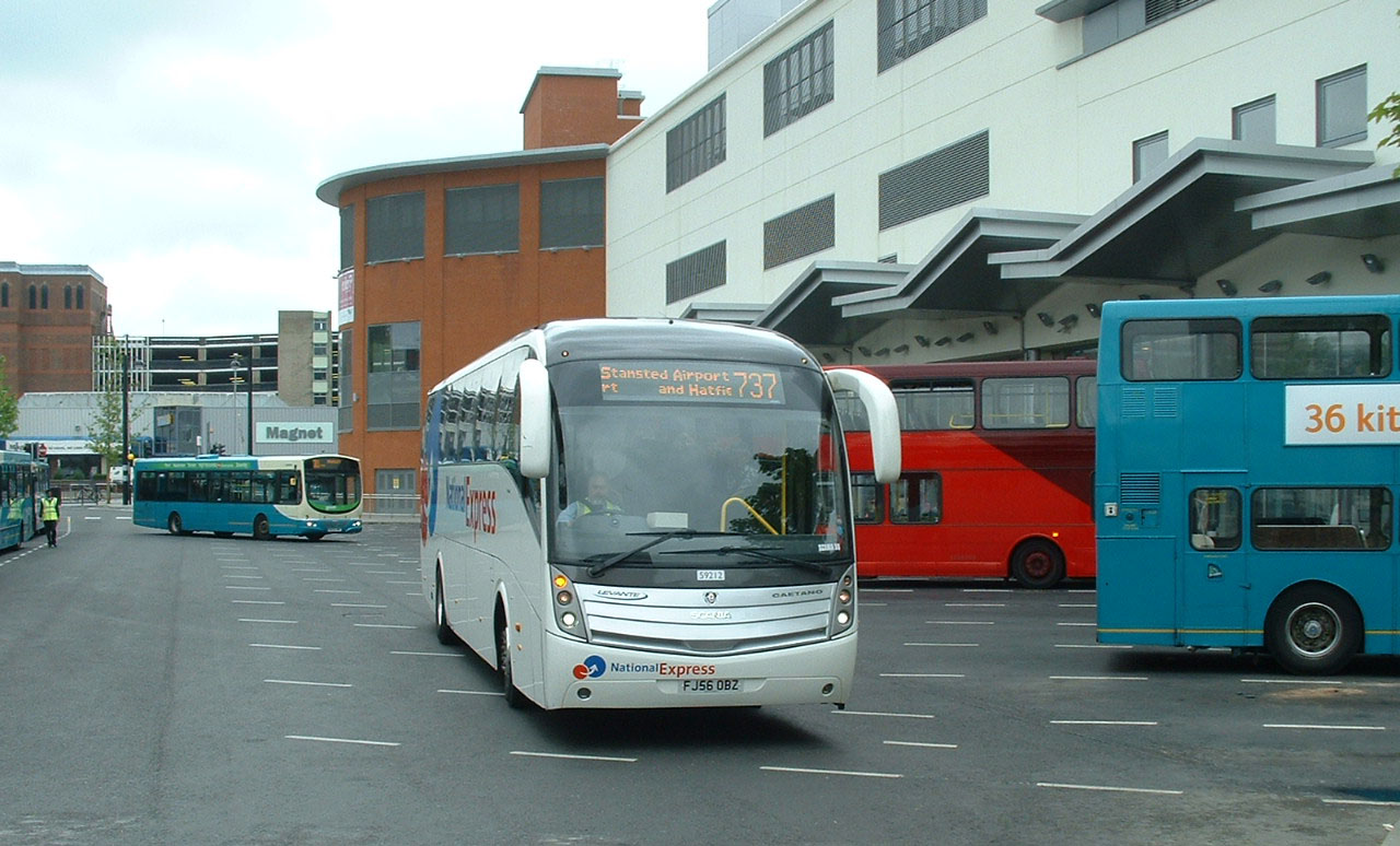 Stagecoach Oxford had taken responsibility for National Express route 737 from their home city across country to Stansted Airport. The initial fleet consisted of standard, at the time, Scania K340EB coaches with Caetano's Levante bodies, supplied exclusively in the UK for National Express work. Seen leaving High Wycombe's then new Bus Station in May 2007 is 59212 (FJ56OBZ). |