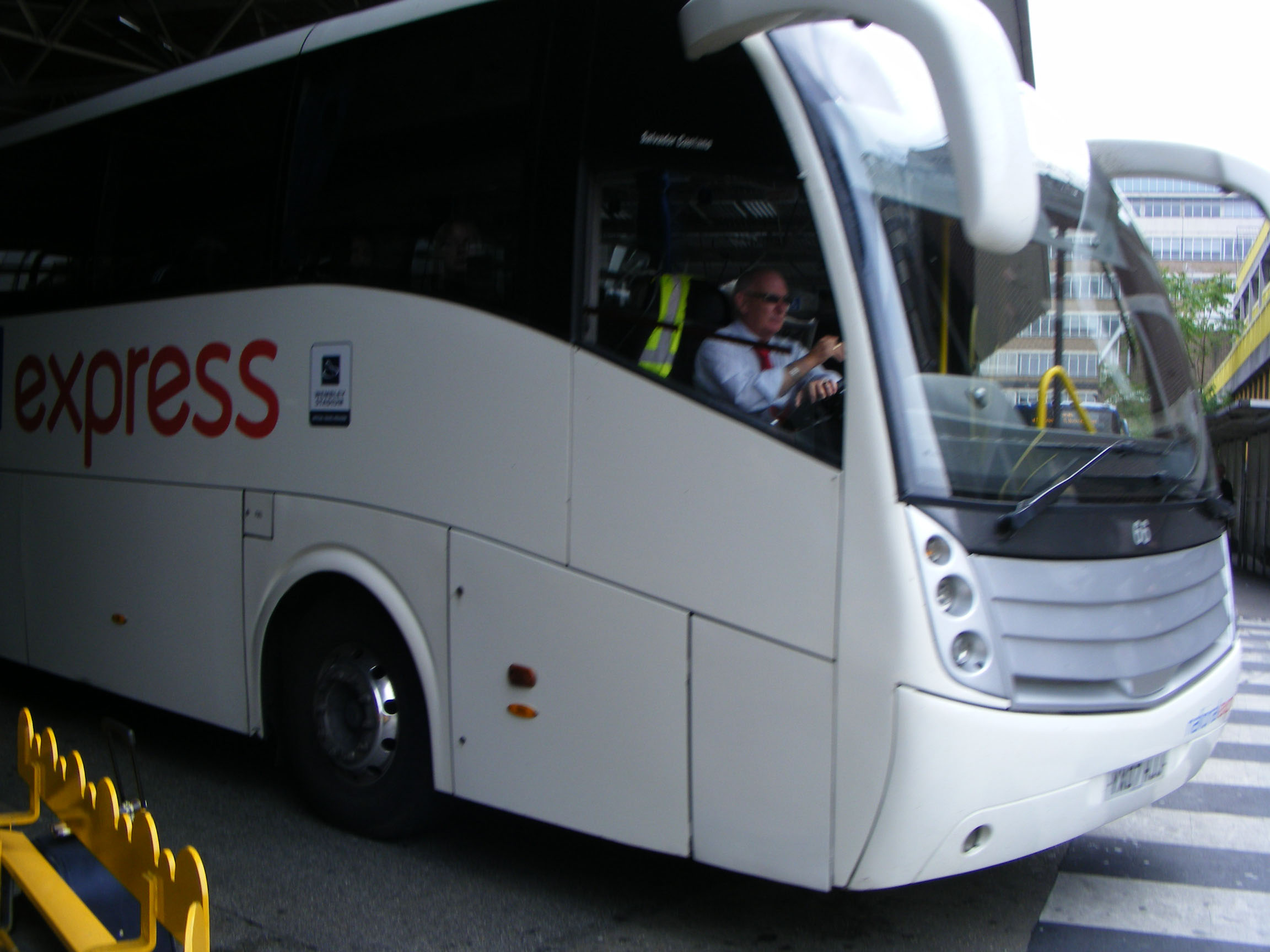 Edging out of Victoria Coach Station in April 2011 is East Yorkshire's Volvo B12B 66 (YX07HJJ).