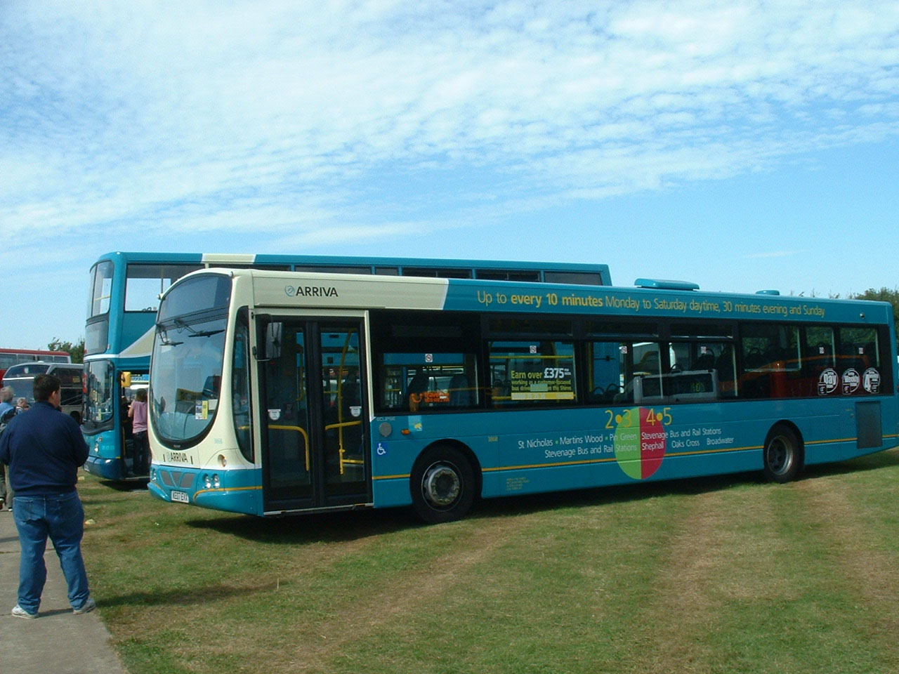 Arriva's Scania Omnicity, 3551 (YN56NNB), is in Warwickshire County Council's County Links livery. It is sandwiched between two other non standard liveried Arriva buses. On the left is a new Enviro200 in red for the London operations, ENL9 (LJ07EBU) and on the right, in red and blue, a VDL SB120/Wright 3736 (YJ07JVY), for the MK Metro fleet, now owned by Arriva.