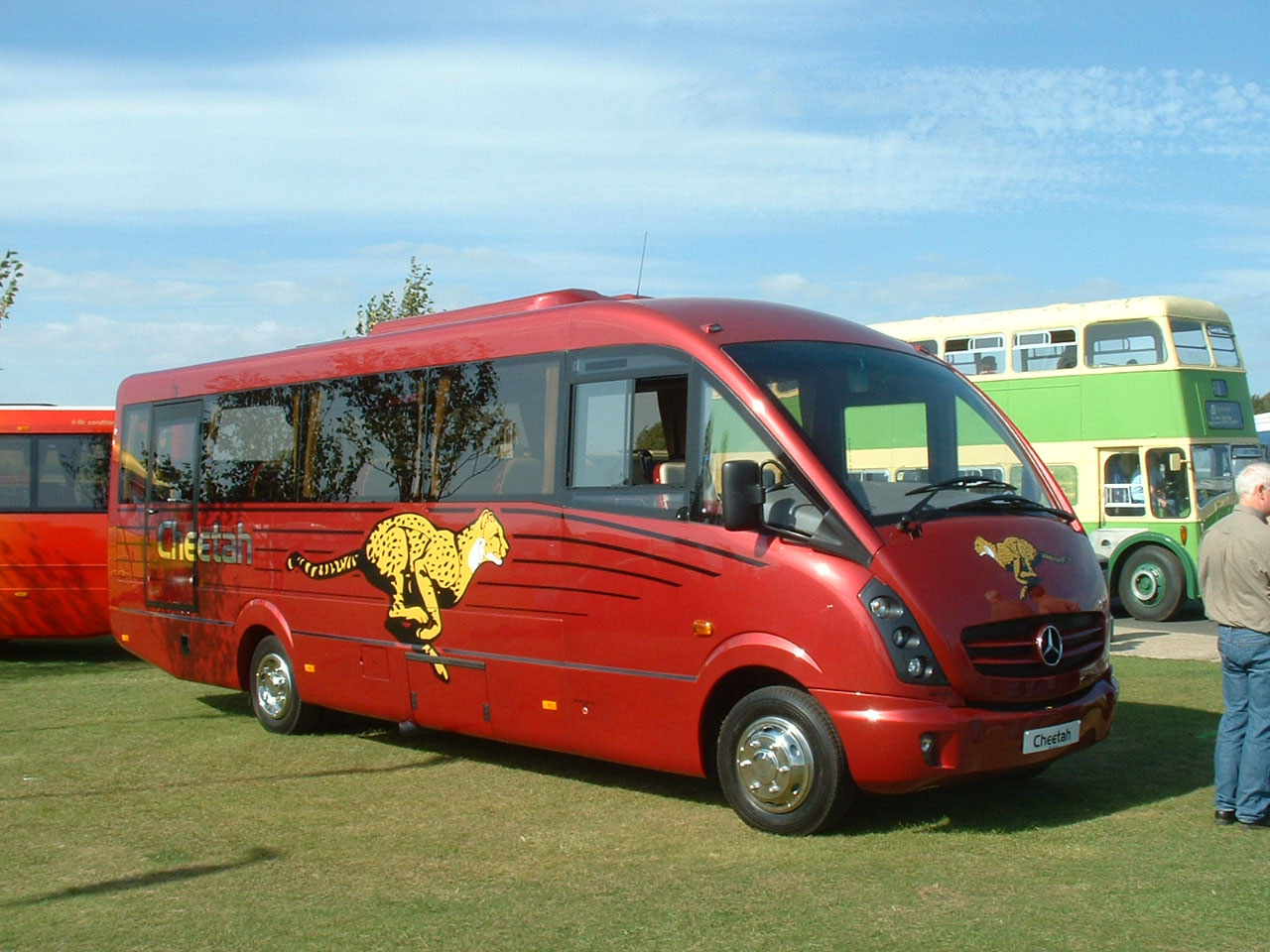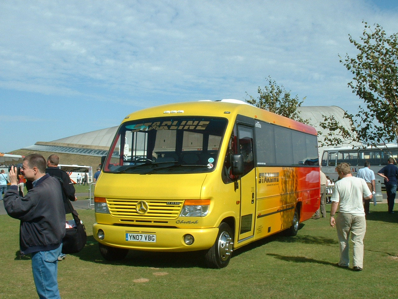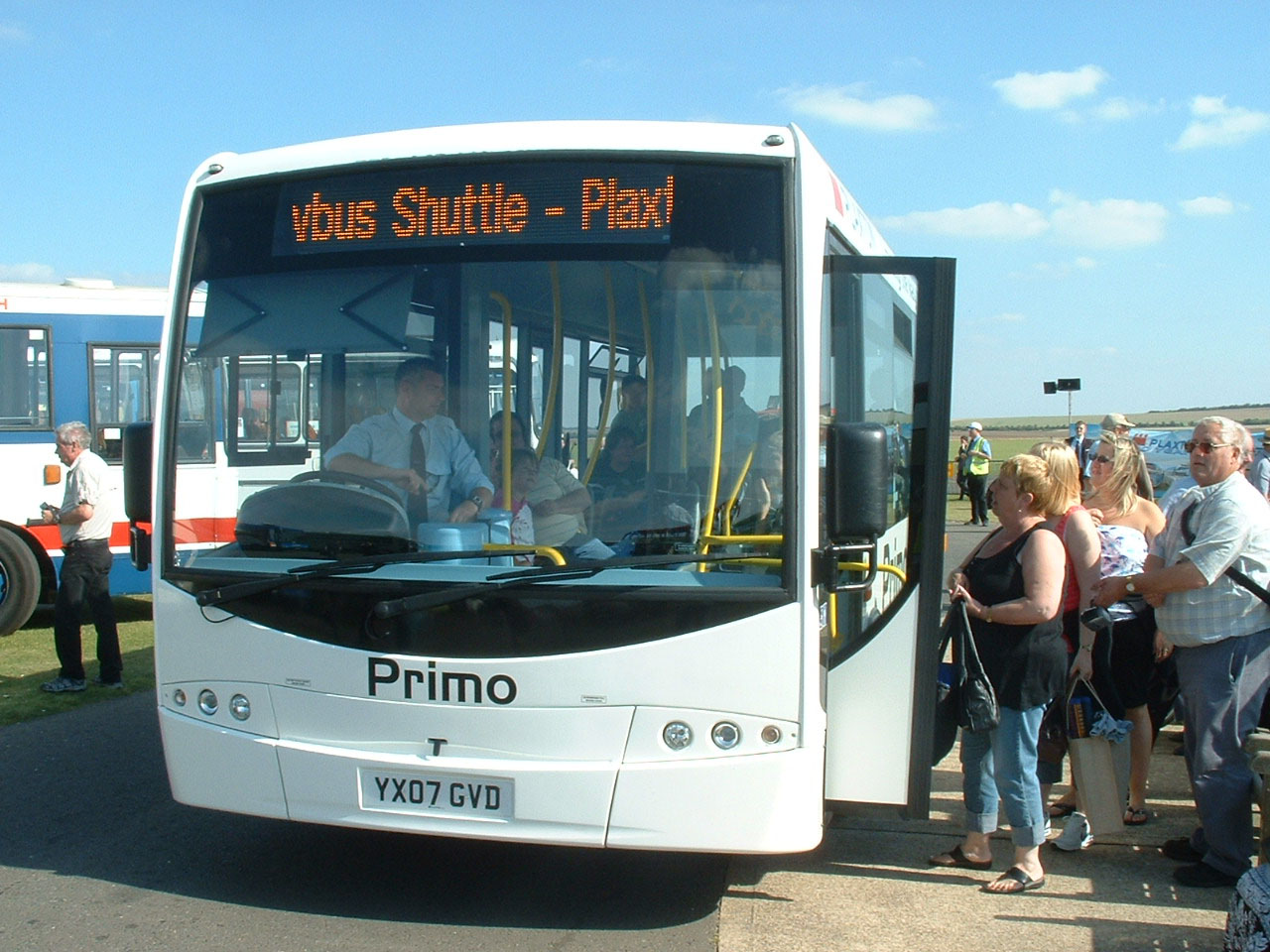The Plaxton Primo was developed as a low floor successor to the Mercedes/Plaxton Beaver minibus. This model, YX07GVD, seats 28 and was, as the destination shows, used on the Site Shuttle at Showbus 2007. It is seen loading next to the Plaxton Cheetah display.