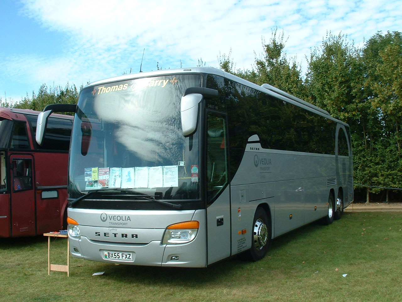 The consolidated operations of several acquisitions in South Wales are now known as Veolia Cymru. This Setra is in the new coach livery, but still has "Thomas of Barry" across the top of the windscreen.