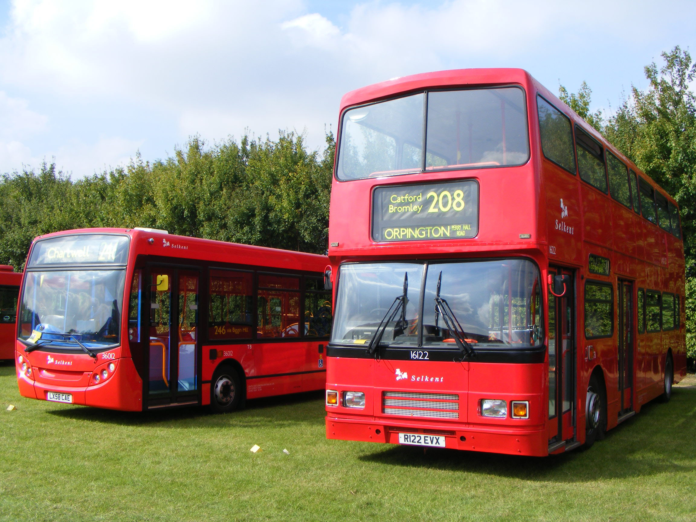 Two representatives from the Macquarie Bank owned Selkent fleet. At opposite extremes a brand new Enviro200 singledecker and a - for London - elderly, non low floor decker, Volvo Olympian/Alexander 16122 (R122EVX), now confined to school runs.