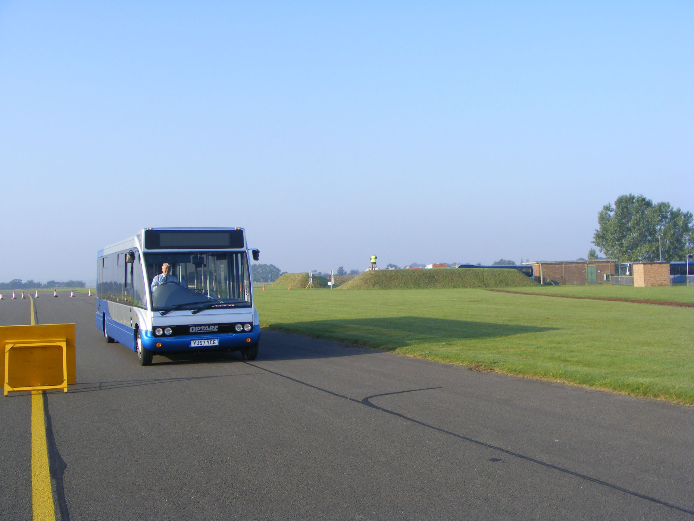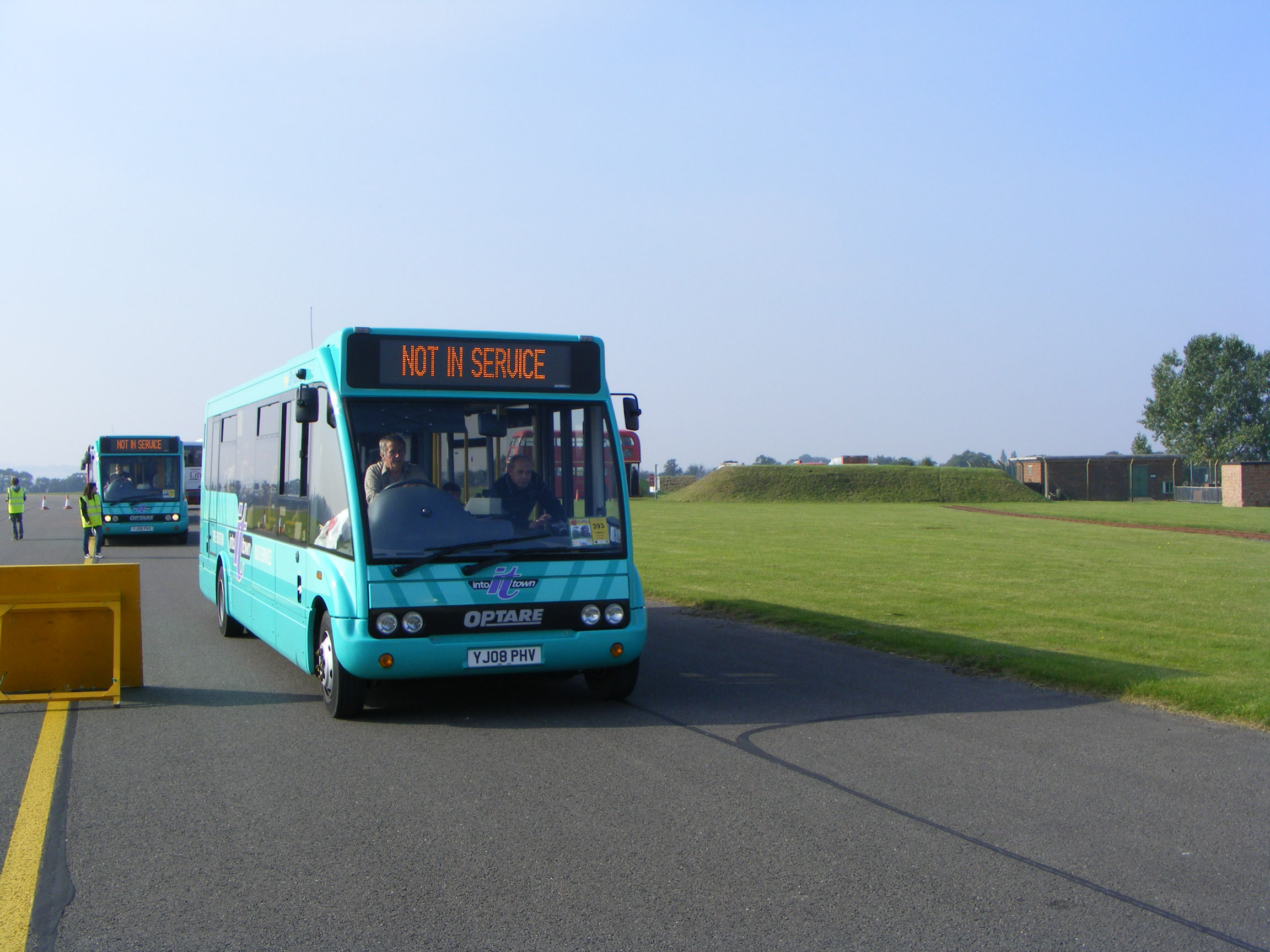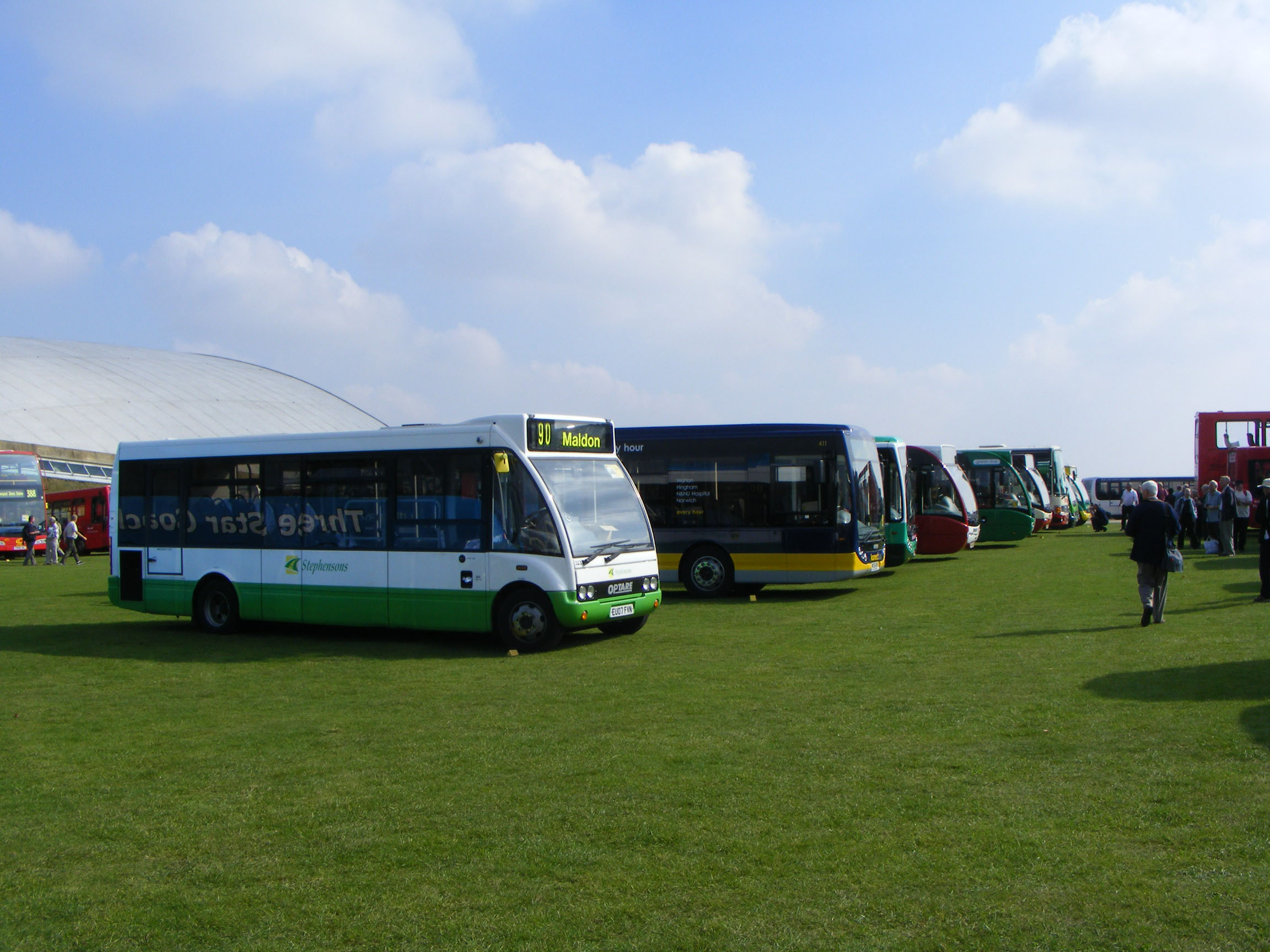 The new Optare company put on an impressive display at Showbus. This Solo was one of three demonstration vehicles on view joining a Versa and Tempo. YJ57YCE is seen arriving at Showbus in Optare's long standing silver and blue demonstrator livery.