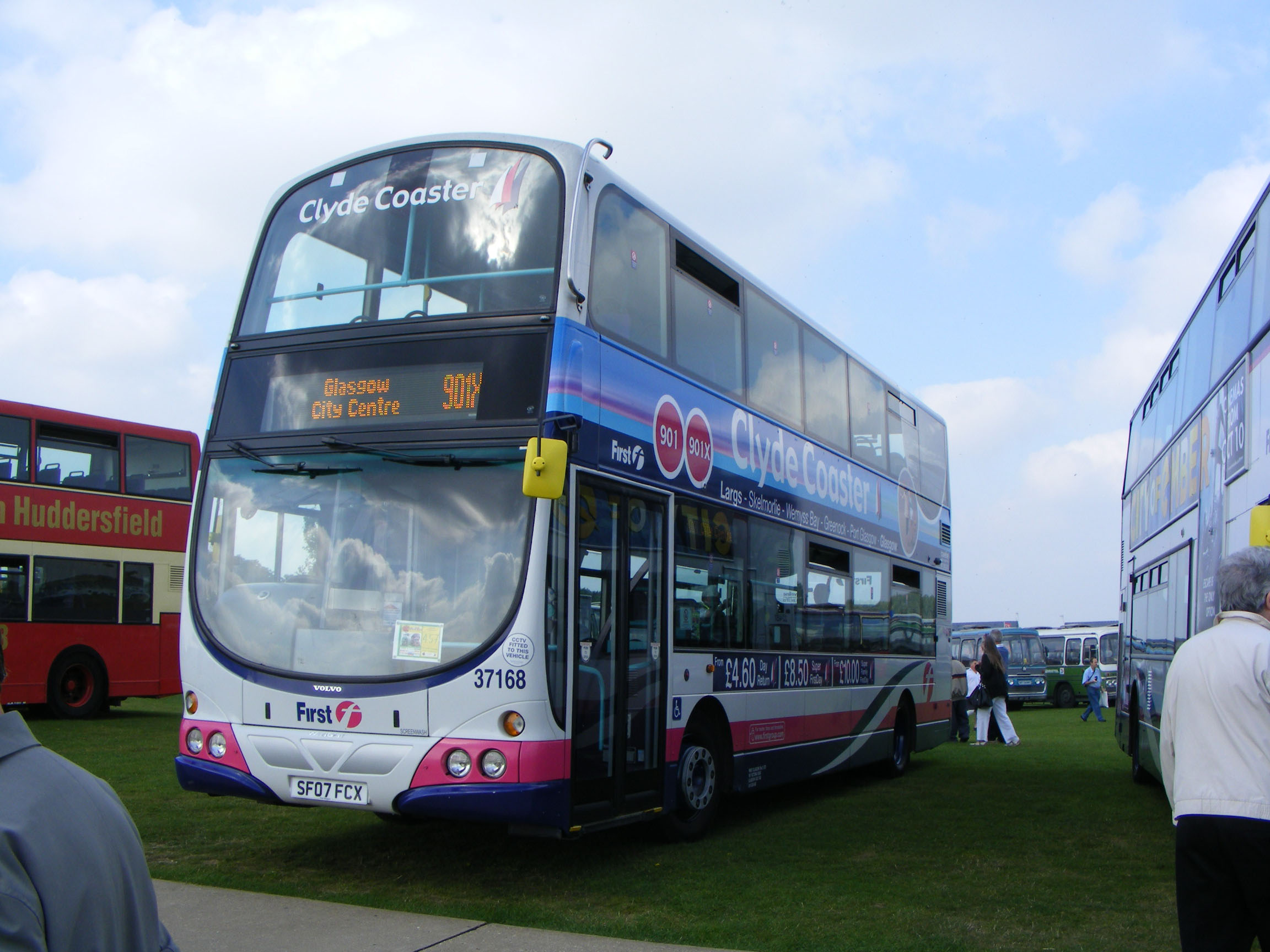 Seen arriving at Showbus is First Glasgow 37168 (SF07FCX), a Volvo B7TL with Wright Eclipse Gemini body with new Clyde Coaster branding.