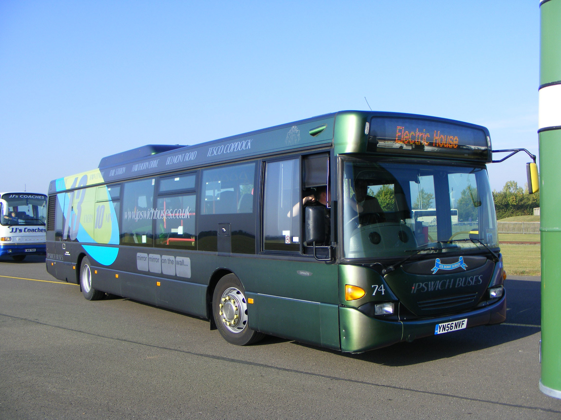 Ipswich's Scania Omicity 74 (YN56NVF) is seen arriving at SHOWBUS on the Sunday morning. It was later to be found in the "stalls on board" area behind a mountain of bus paraphernalia on sale for charity.