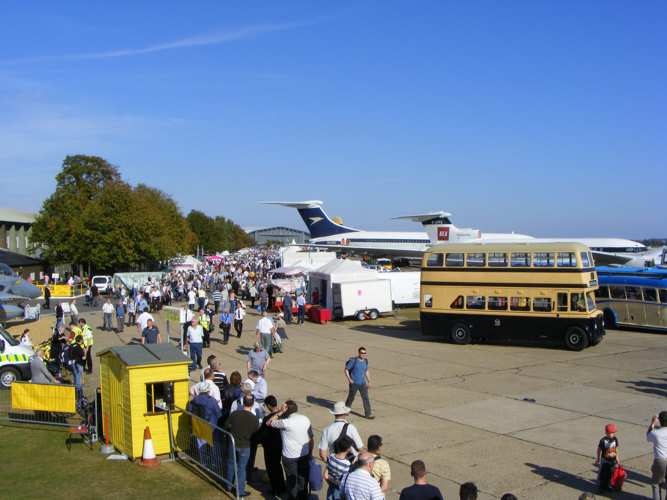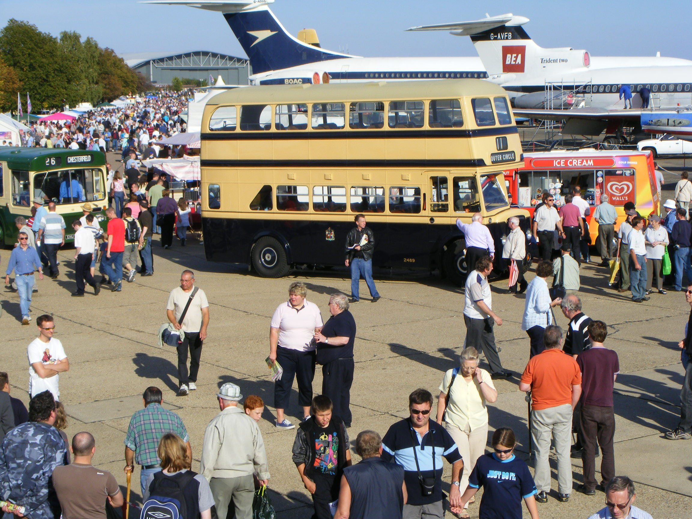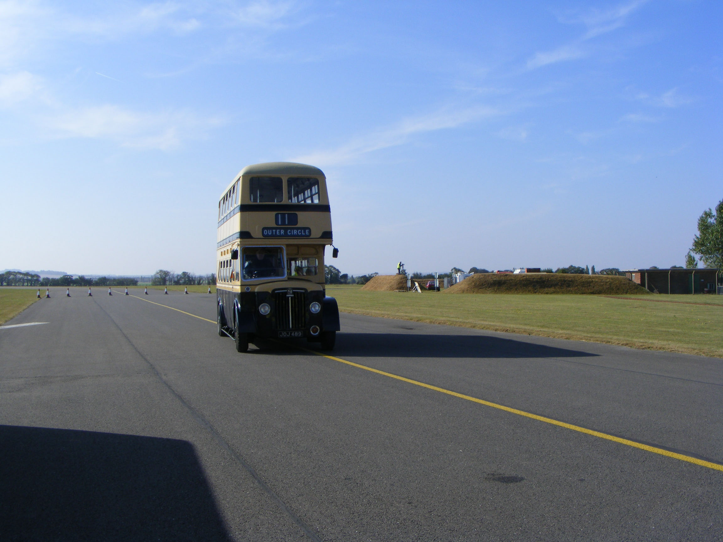 Mid afternoon and 2489 is resting between its five runs on the Duxford village tour. Chesterfield's Panther is seen arriving from the village with a full load and in the foreground Dave Harvey talks to Liz Chubb, the Duxford Tour supervisor.