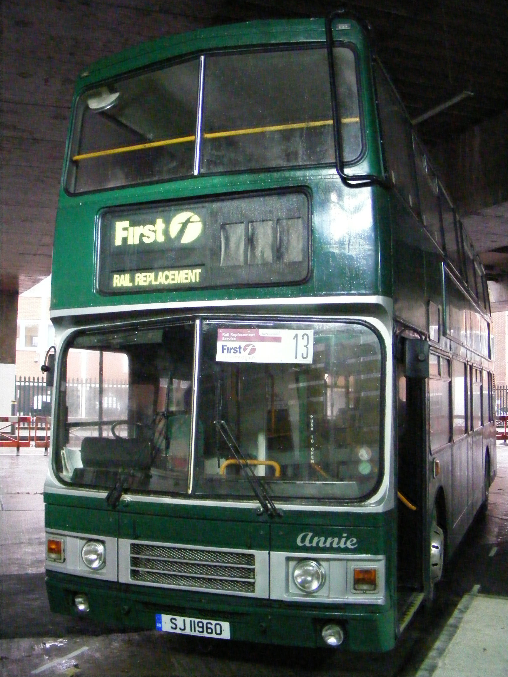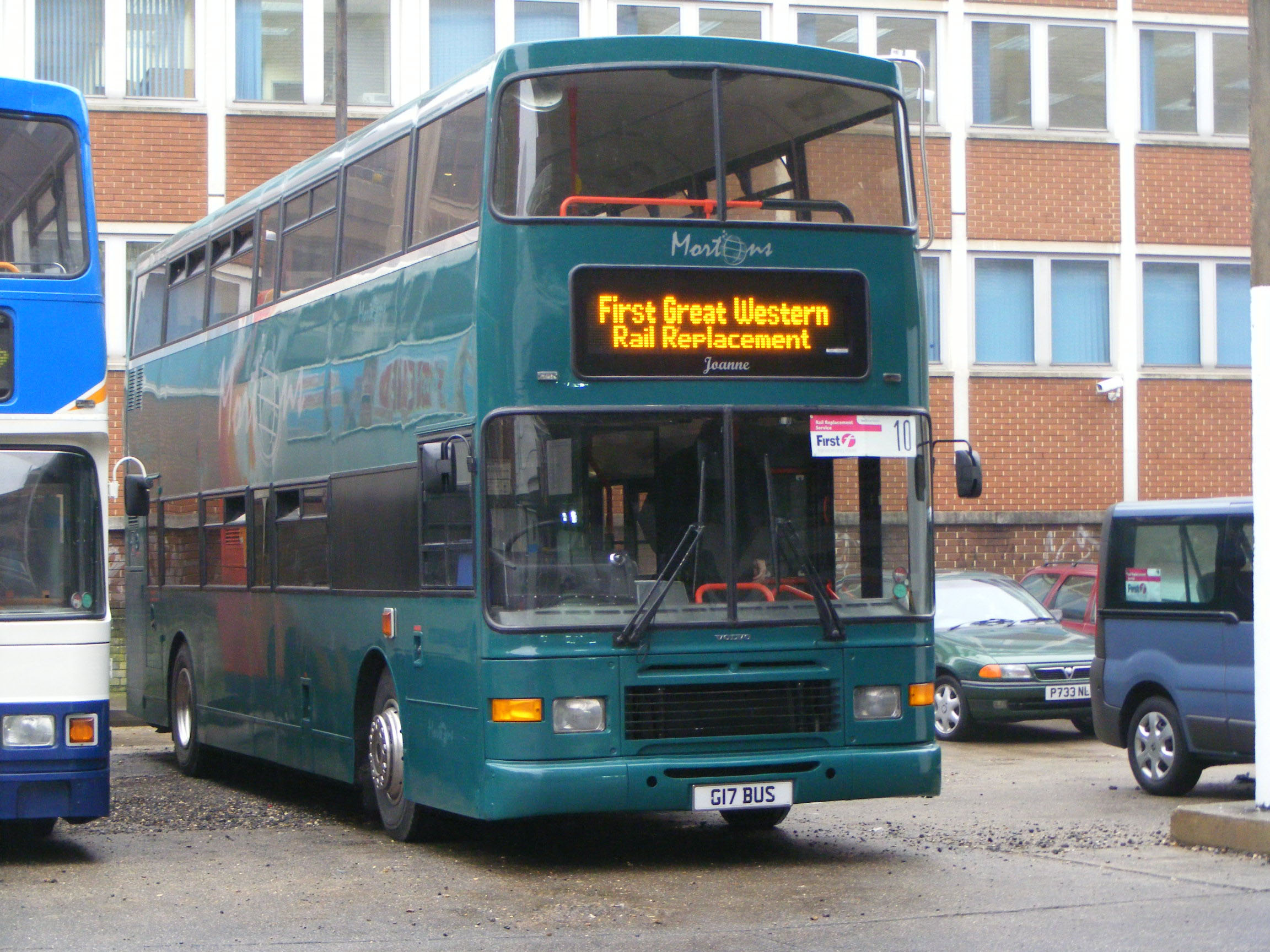 Former Lothian 840 (J840TSC) became SJI1960 in Morton's doubledeck bus fleet. Their distinctive smart green deckers have been popular with enthusiasts. The Alexander bodied Leyland Olympian is seen in the old Thames Valley bus station in Reading - now demolished - which, after being mothballed for years, was pressed back into service for the Reading blockade in December 2010. The "First" blind - an acknowledgement to First Great Western - was a nice touch.