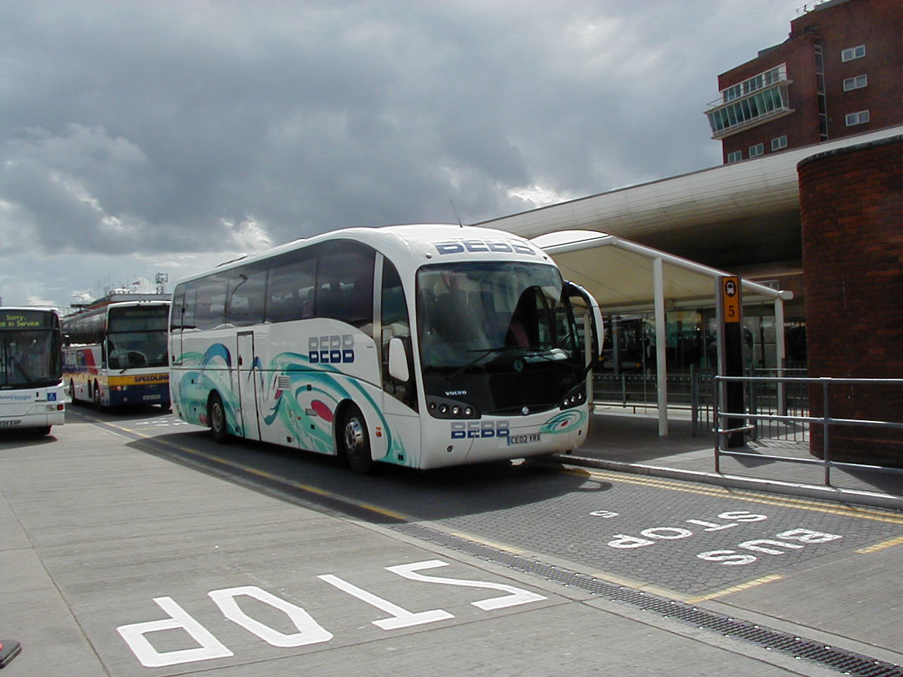 Seen in full fleet livery in Cardiff Bus Station in July 2003 is Sunsundegui bodied Volvo B12M 57 (CE02YRX). The coach later worked for Swift in Great Yarmouth