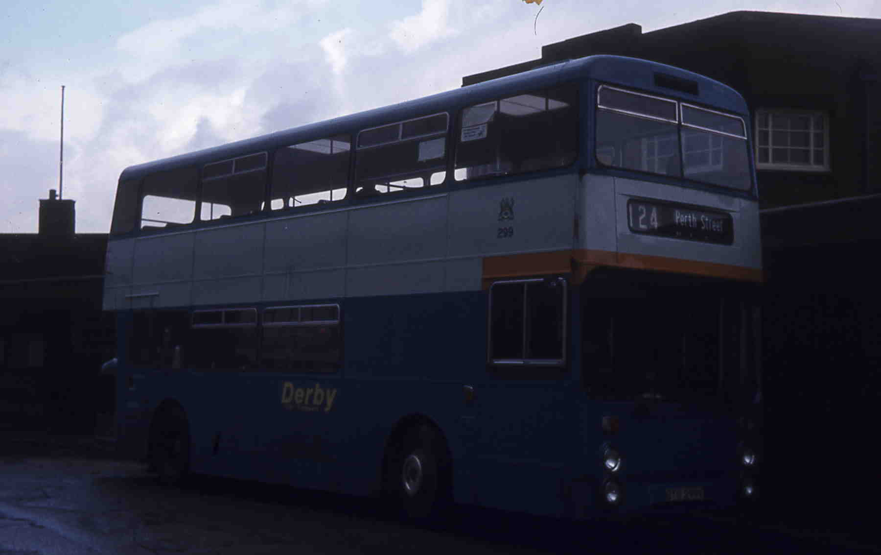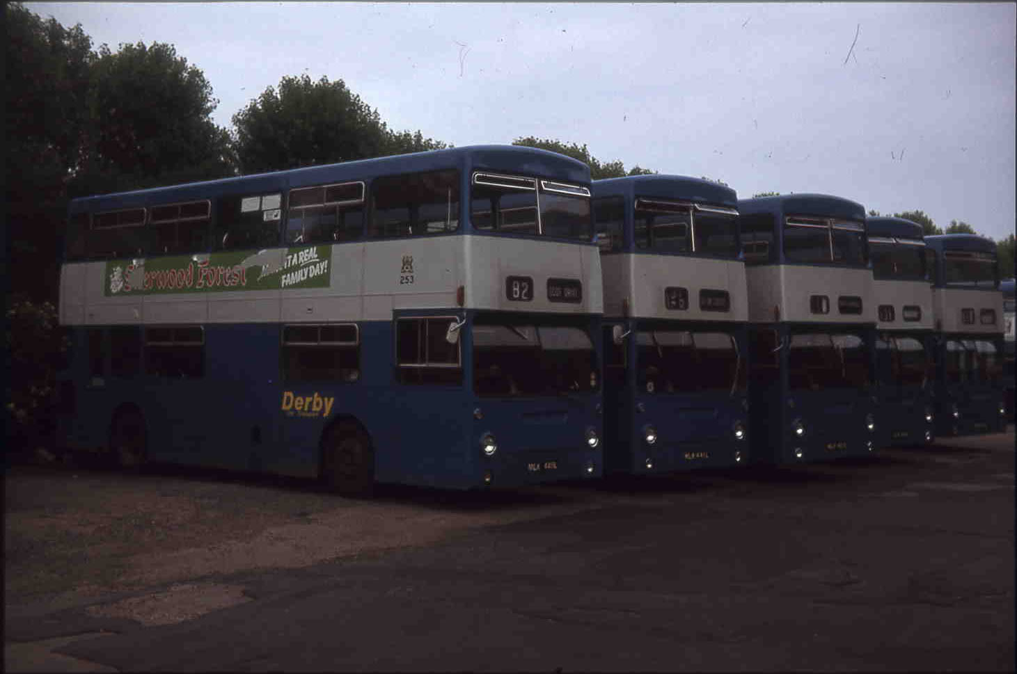 In 1979 Derby took the opportunity to reduce its average fleet age on the cheap with three ex London DMS 253-255 (MLK440-442L) followed by 250 (JGU283K) and 256-259 (MLK463/465-467L) the following year. Five of the eight are lined up here in the depot, not long after acquisition with 253, DMS440, first in line. All are Park Royal bodied Daimler Fleetlines. Three more R-registered DMS followed in 1986.