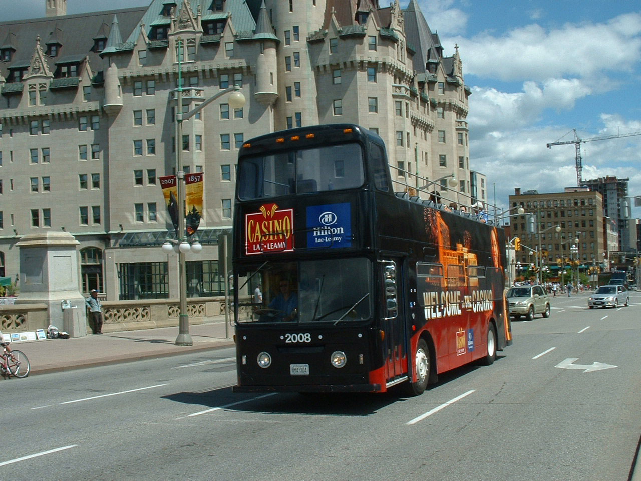 In July 2007 Greyhound Canada had the franchise for the Gray Line bus tours of Ottawa. This former Derby Roe bodied Daimler Fleetline open topper is seen in Rideau Street by Confederation Square with the Hotel Chateau Laurier behind. The bus used to be 249 (CRC249J) but was then Greyhound Canada 2008 (BM4-304). |