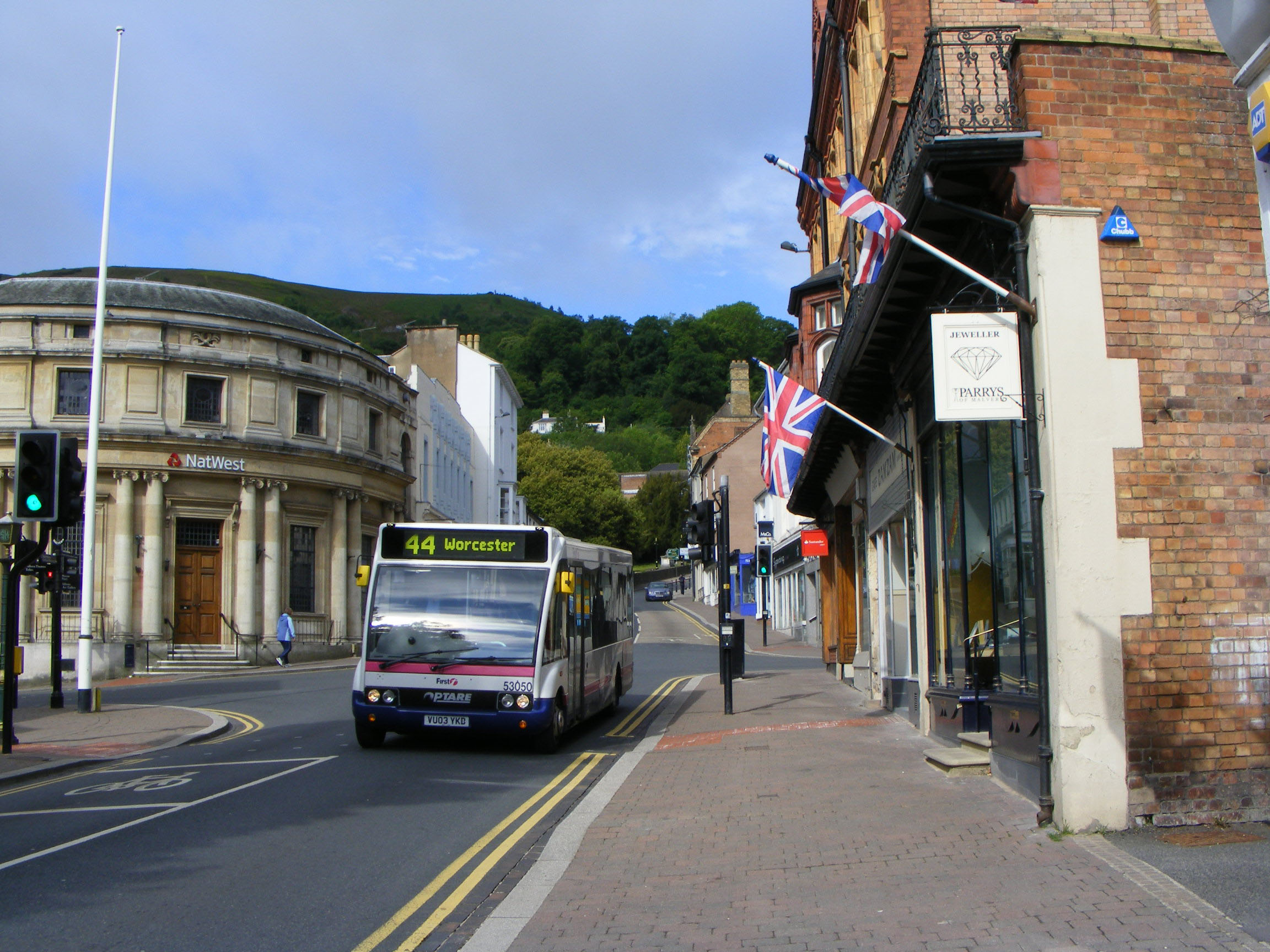 Another May 2011 view in Malvern, though the flags may make you think it was 2012 (Diamond Jubilee year). First Midland Red Optare Solo 53050 (VU03YKD) is on the 44 to Worcester, a far cry from the days of BMMO D9s on the 144. ![]() |