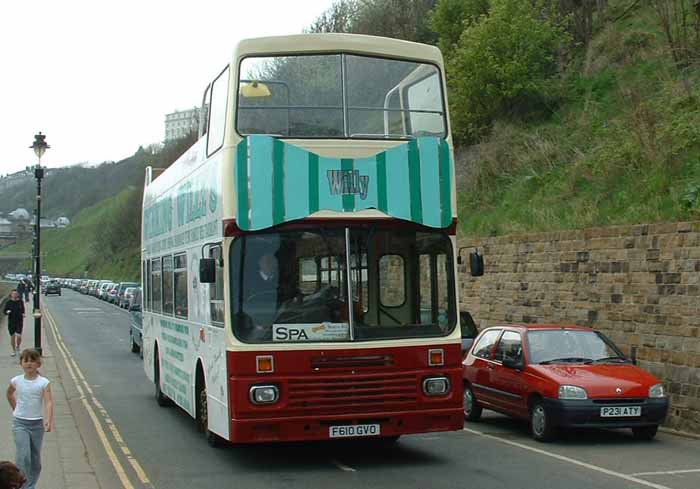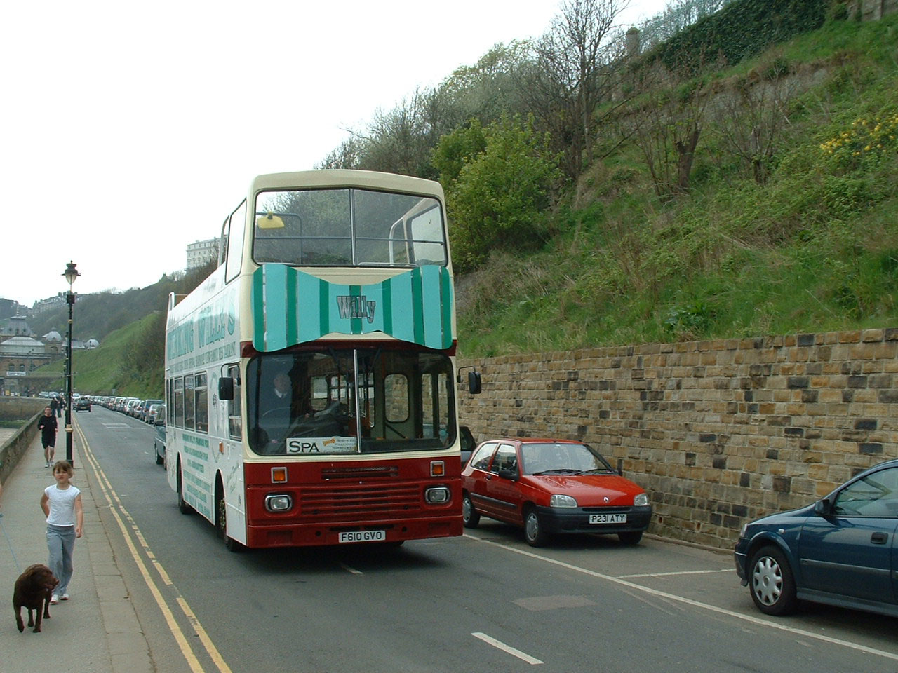 Former Trent Alexander bodied Volvo Citybus 610 (F610GVO) has lost its roof to enjoy a retirement with East Yorkshire on Scarborough sea front. The bus has been christened Willy and gained a big stripey bow tie! The bus is an advert for Willy's Fish and Chip Shop. The picture was taken early in the 2007 season in April.