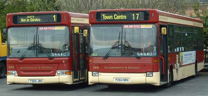 The Plaxton Pointer body originated with the manufacturer's Reeve Burgess subsidiary. It was adapted for the low floor Dart SLF in the version seen on the right for Scarborough & District's 264 (P264NRH). Ogle assisted in a redesign of the body to produce Pointer 2 as seen on 304 (T304NRH). Both buses were seen together in Scarborough in April 2007.